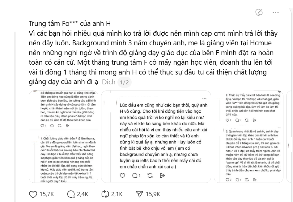 Trên nền tảng Threads, một tài khoản có tên D. mới đây đã chia sẻ trải nghiệm cá nhân khi theo học tại trung tâm luyện thi IELTS "của anh H." được cho là do sáng lập. D. chia sẻ, vì ngưỡng mộ sự tâm huyết và hình ảnh “truyền cảm hứng học tiếng Anh” của anh nên bạn đã đăng ký khóa học tại đây. Tuy nhiên, sau một thời gian tham gia lớp, D. cho biết đã nhận thấy nhiều vấn đề trong chất lượng giảng dạy, đặc biệt là ở đội ngũ giáo viên.