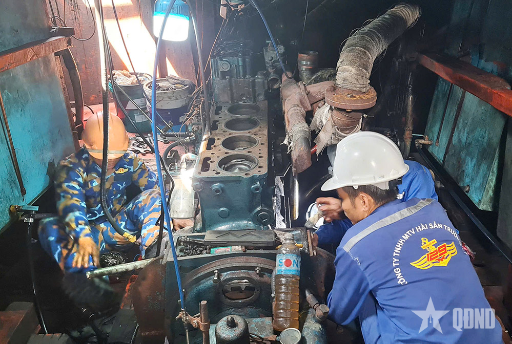 Tổ kỹ thuật kiểm tra, tháo dỡ thiết bị hỏng hóc của tàu cá ngư dân.