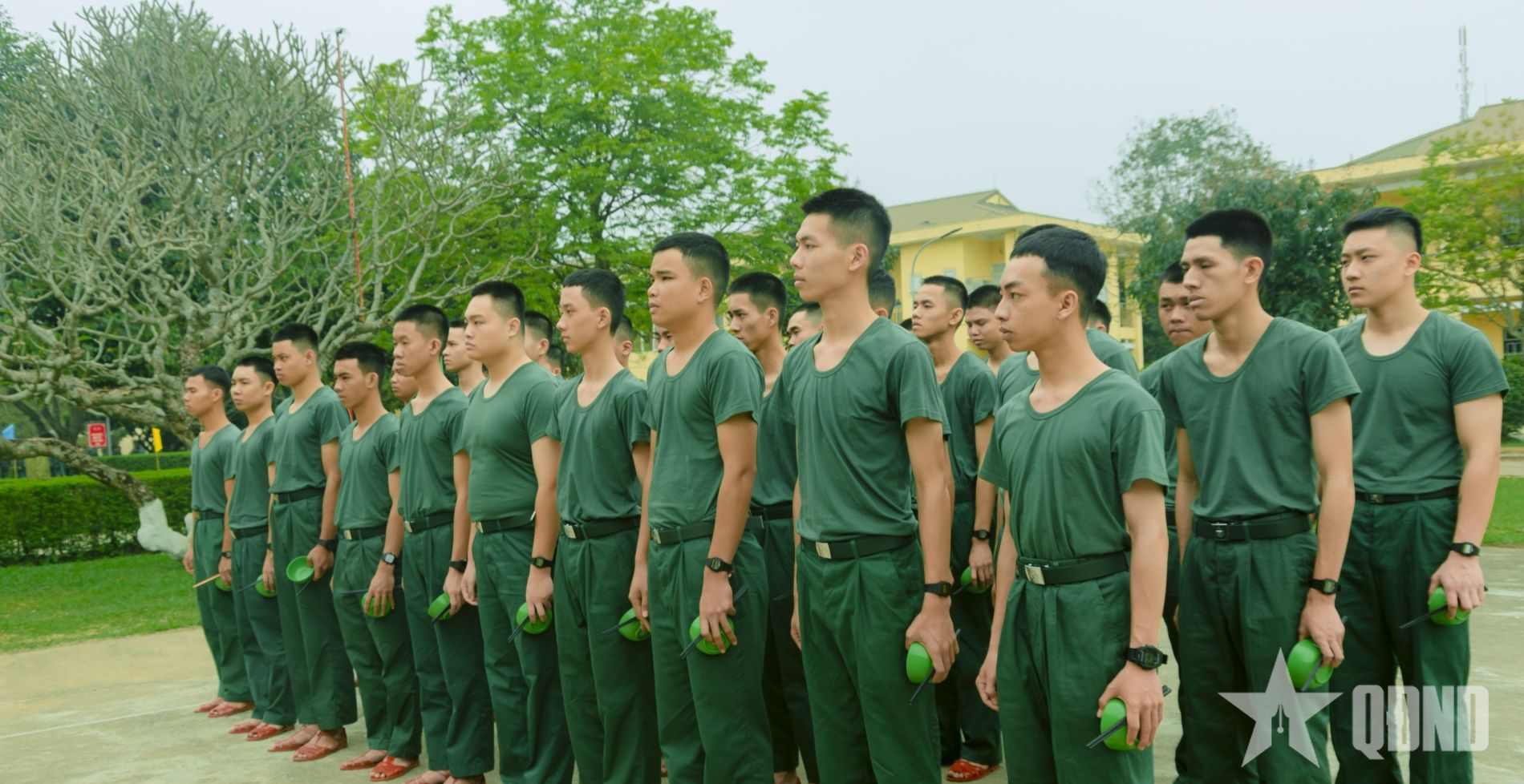 Chiến sĩ mới xếp hàng chuẩn bị cơ động xuống nhà ăn.