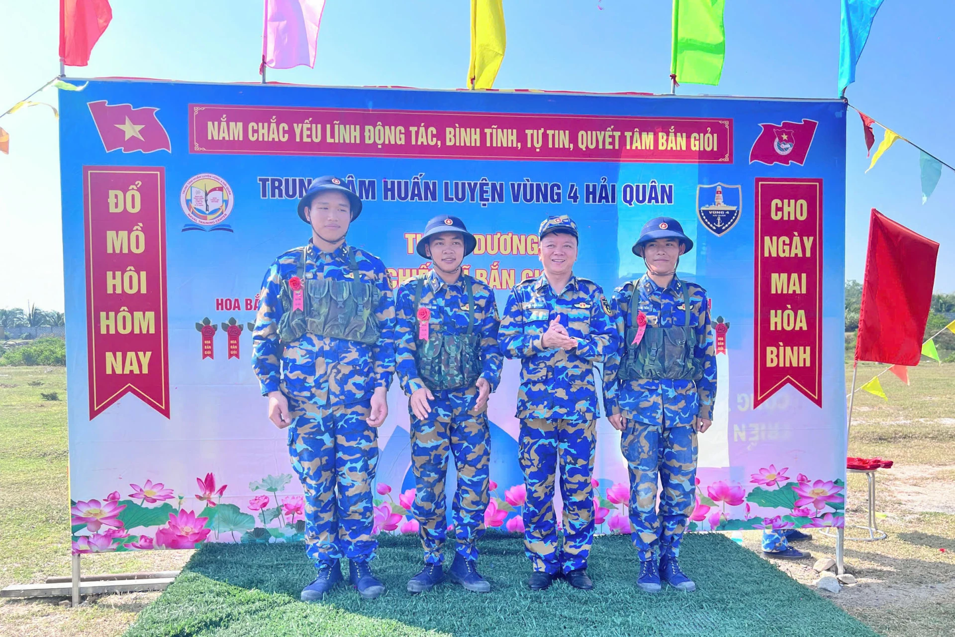 Đại tá Lương Xuân Giáp - Phó Chủ nhiệm Chính trị Vùng 4 Hải quân trao hoa bắn giỏi cho chiến sĩ mới.