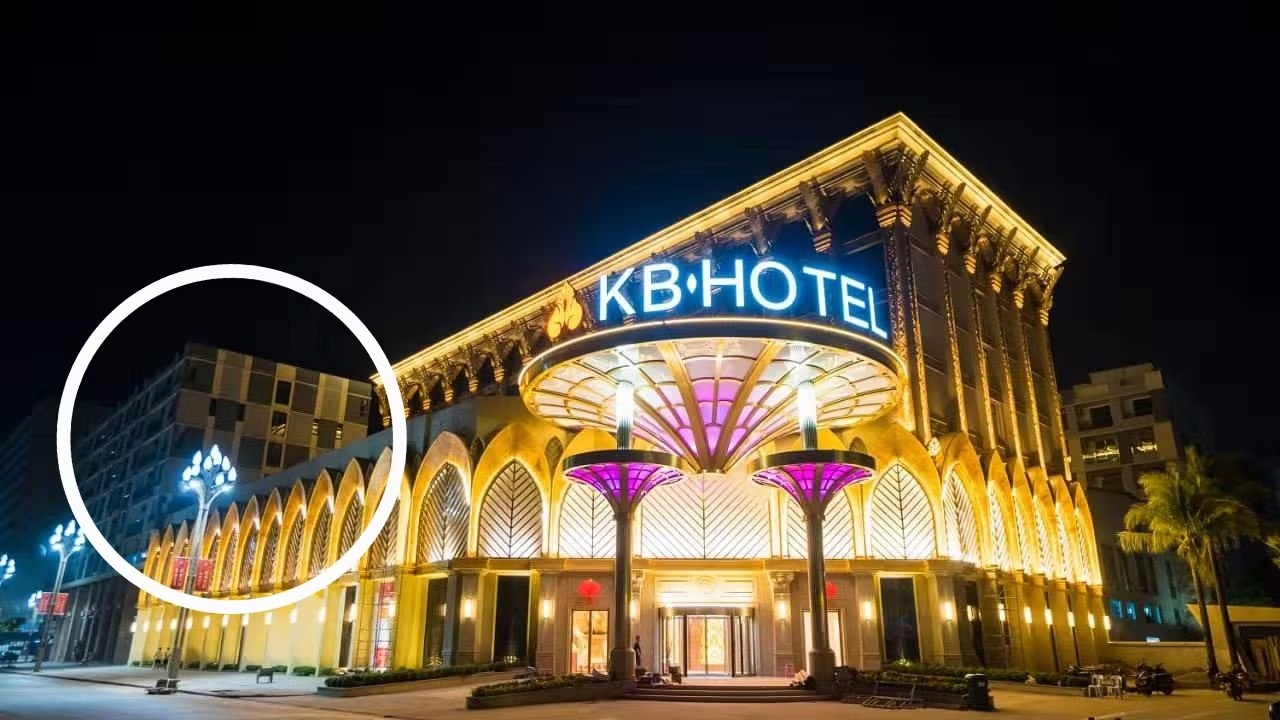 Ảnh quảng bá khách sạn KB đăng trên trang web chính thức của cơ sở này. Tòa nhà được khoanh tròn màu trắng, nằm ngay cạnh khách sạn KB và được trang trí bằng hệ thống đèn vàng rực rỡ, thực chất là địa điểm tổ chức các hoạt động lừa đảo tình cảm trực tuyến. Ảnh: Chosun Daily.
