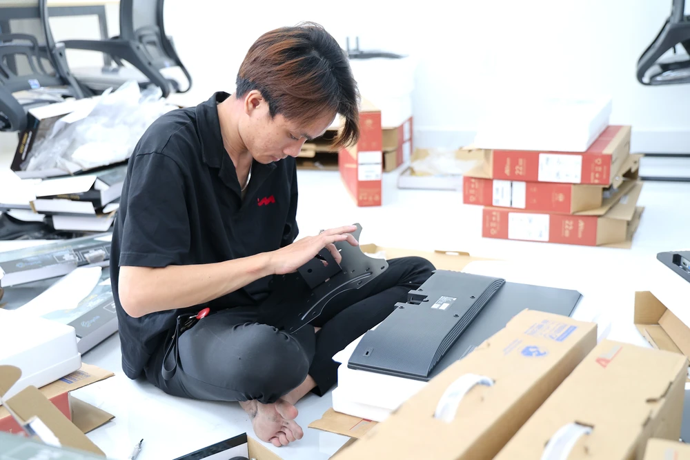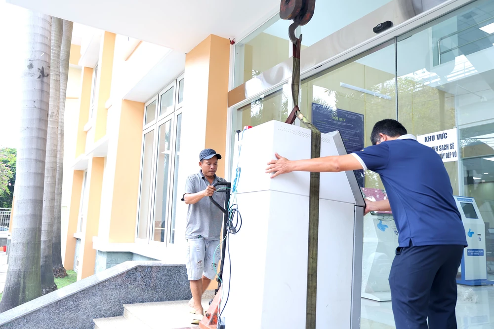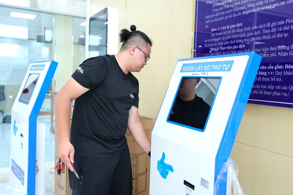 Bộ phận kỹ thuật nhanh chóng mở kiosk lấy số thứ tự để bố trí đúng vị trí. Ảnh: LÊ THOA