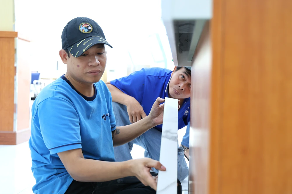 Đội ngũ thi công nốt những hạng mục còn lại. Ảnh: LÊ THOA