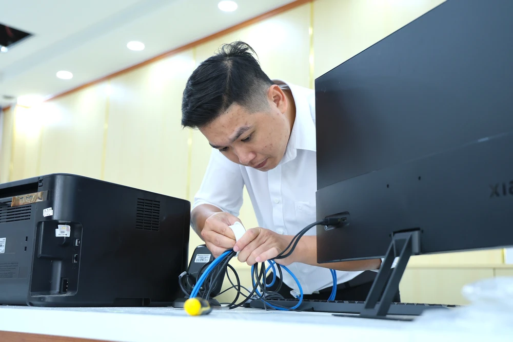Đội ngũ kỹ thuật đang gấp rút hoàn tất khâu lắp đặt thiết bị, máy móc và cơ sở vật chất tại bộ phận tiếp nhận và trả kết quả. Ảnh: LÊ THOA