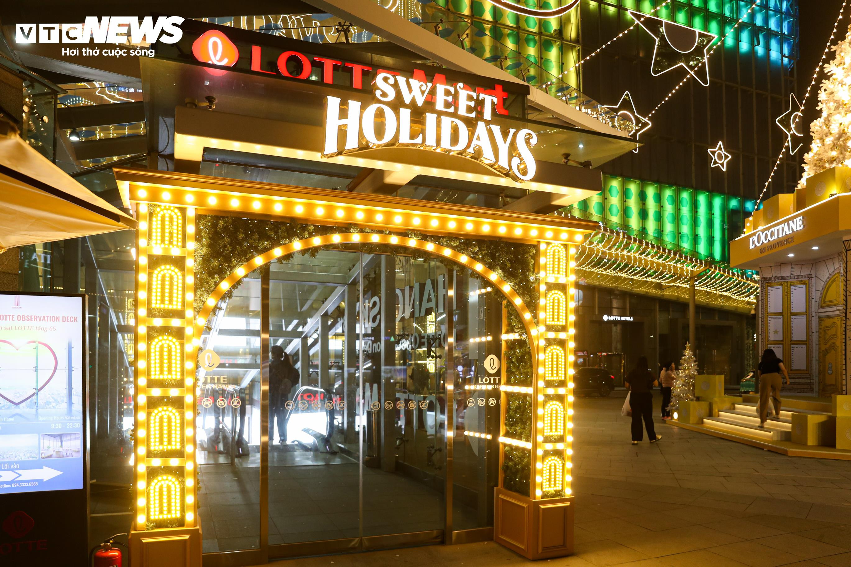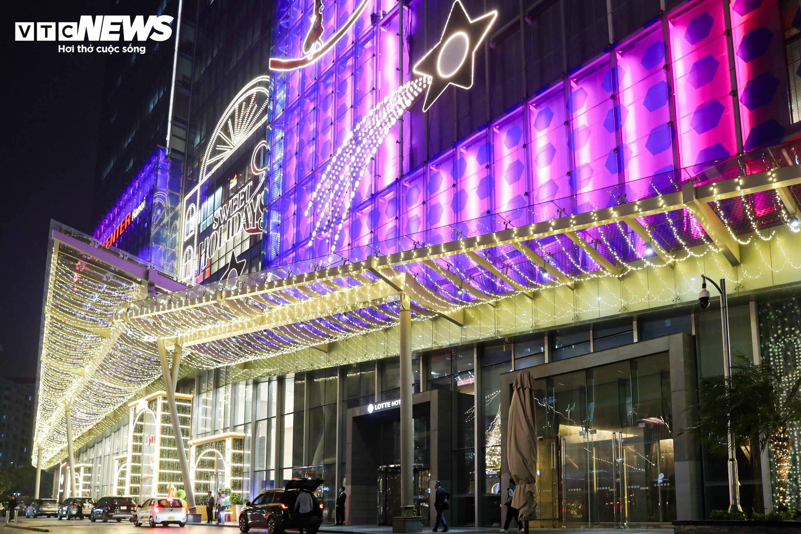Trước cửa trung tâm thương mại Lotte Center Hà Nội cũng mọc lên cây thông Noel khổng lồ, đặt trên một hộp quà rực rỡ sắc màu làm bừng sáng một góc phố.