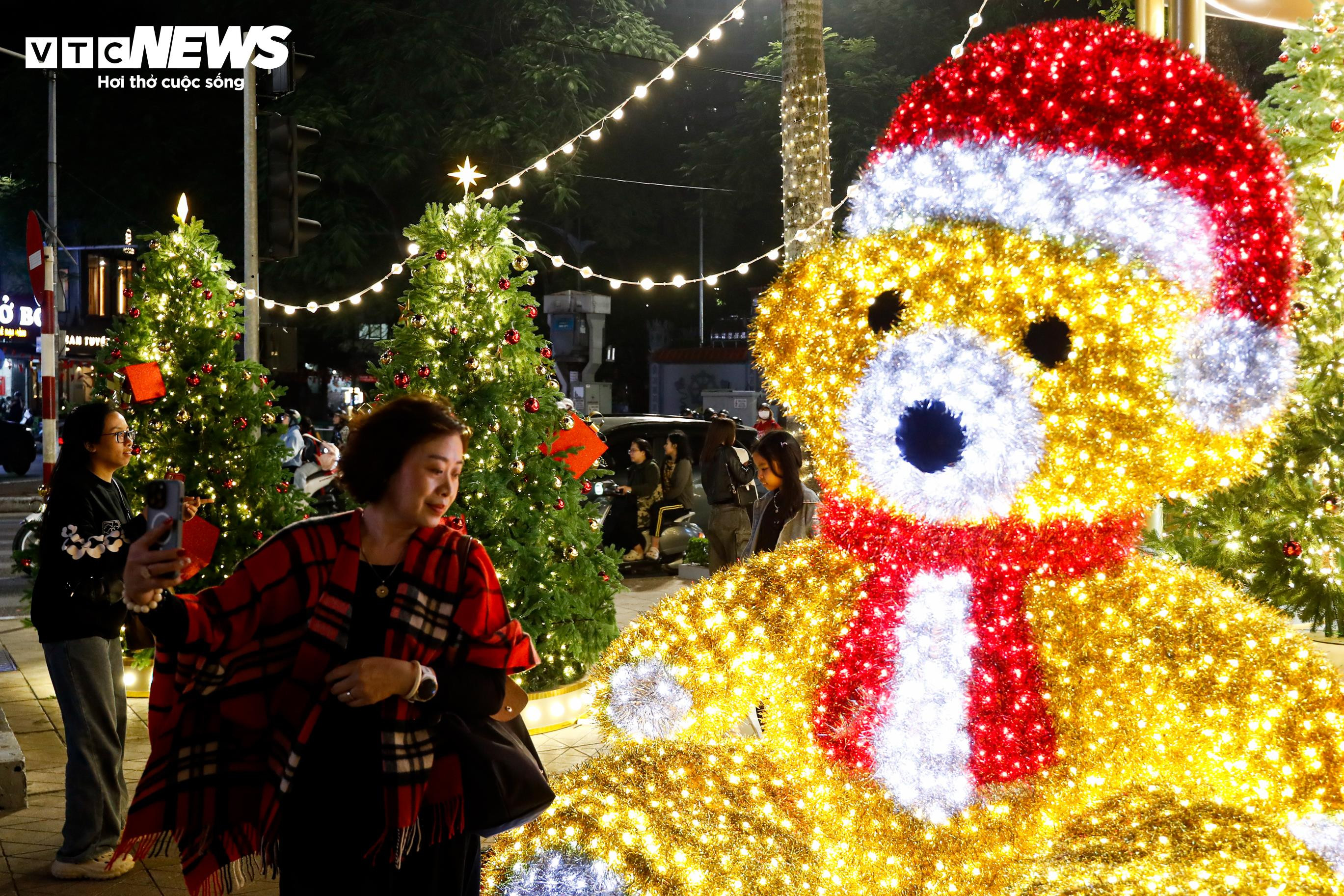 Mô hình gấu bông Noel được tạo từ hàng nghìn bóng đèn cũng thu hút đông đảo người dân đến chụp ảnh.