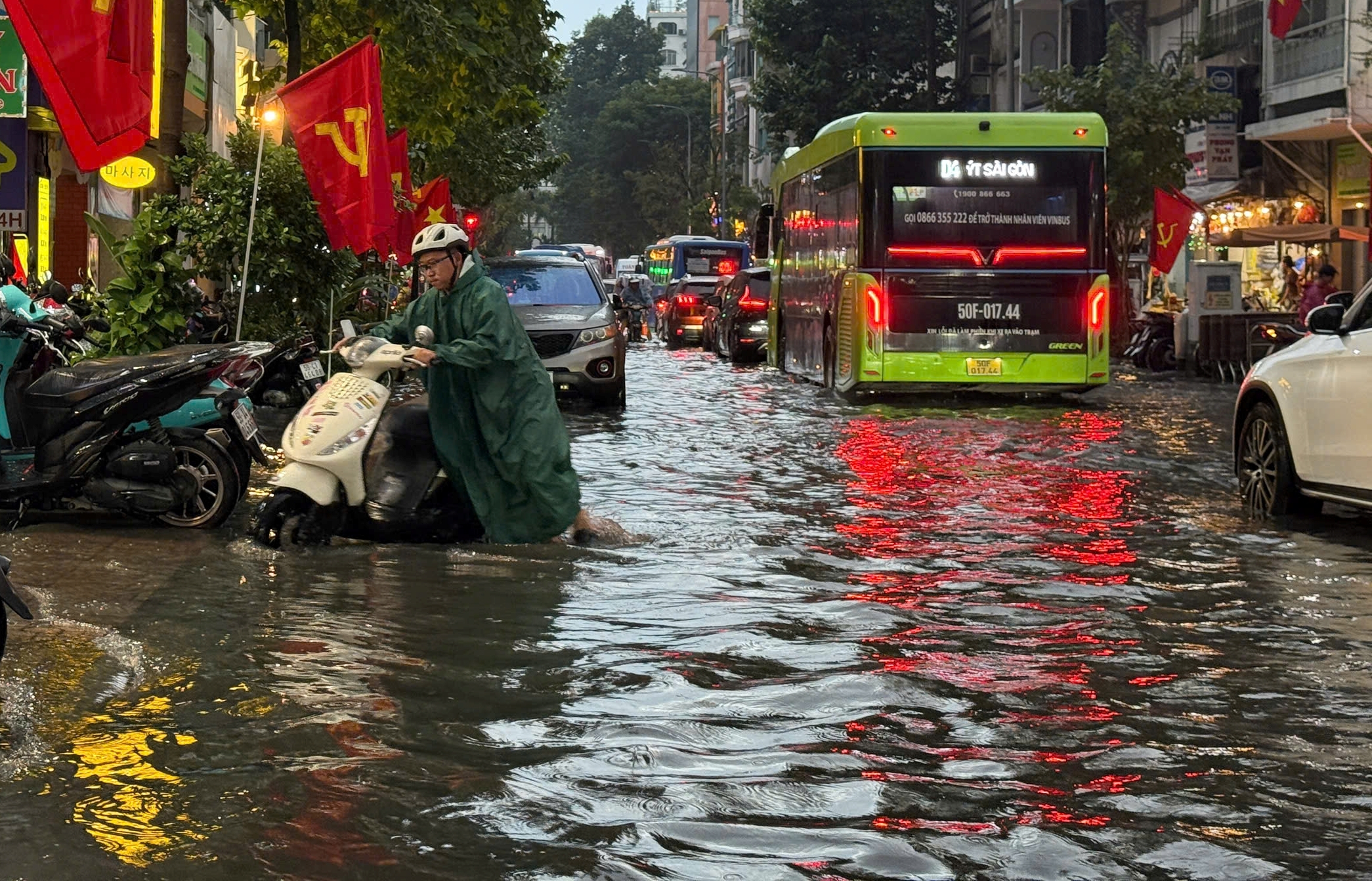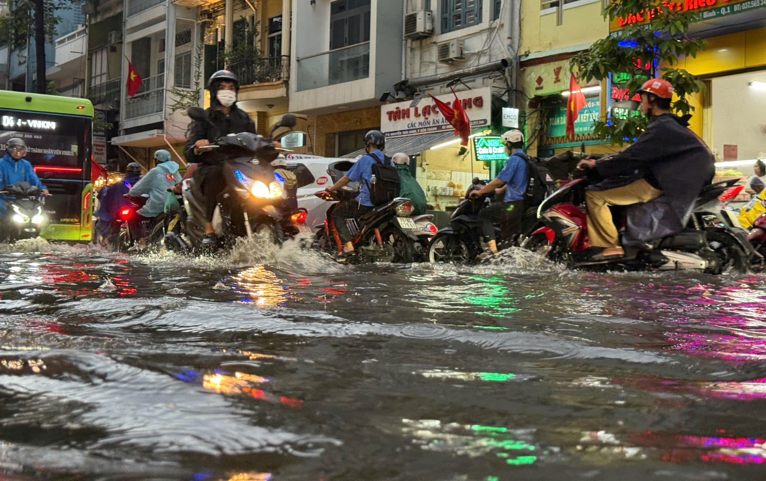 Trung tâm TP.HCM ngập sâu khiến nhiều người đi xe máy phải dắt bộ.