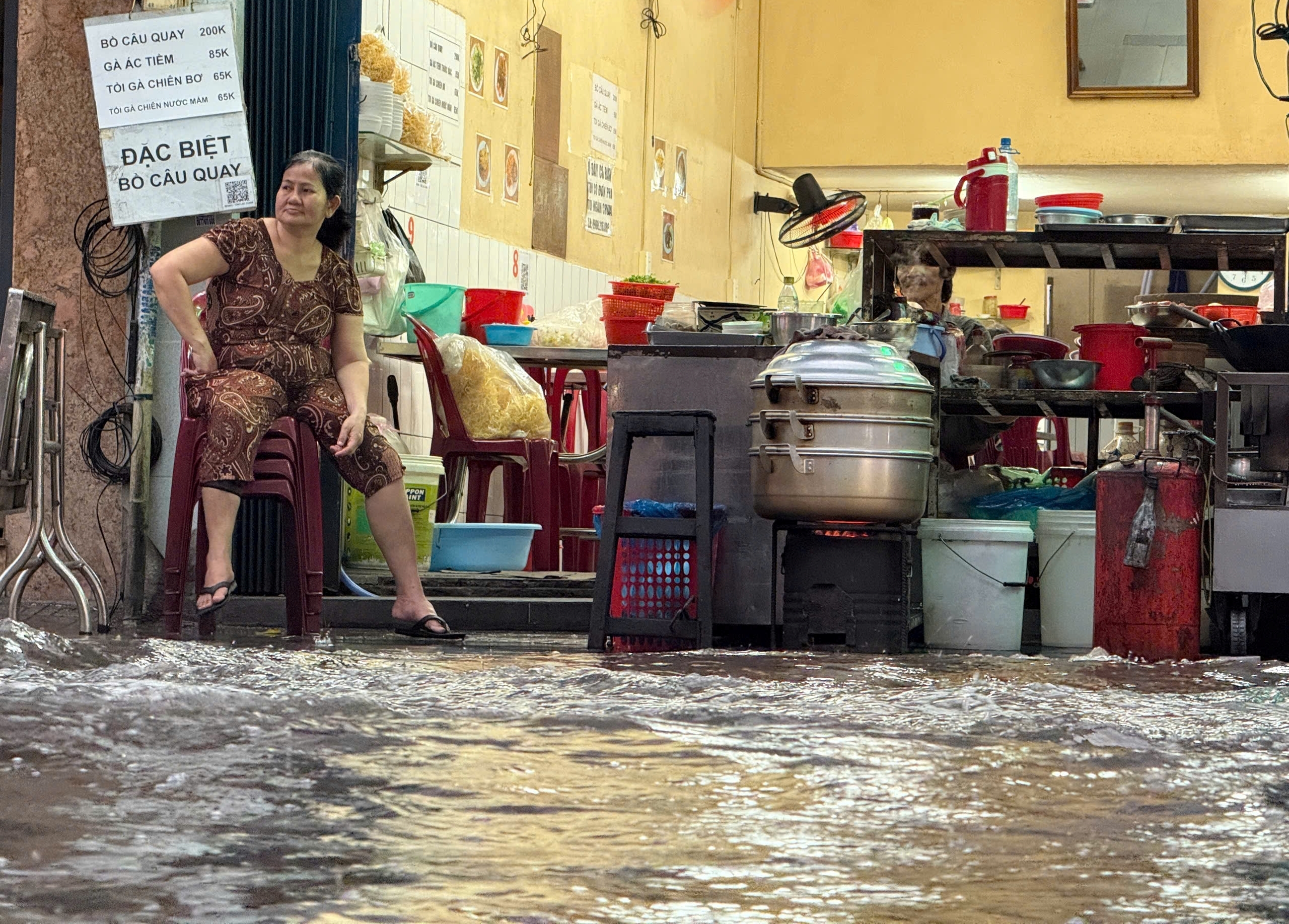 Bà Thanh, người kinh doanh quán ăn trên đường Nguyễn Thái Bình chia sẻ, nước ngập khiến việc kinh doanh bị ngưng trệ. Cả buổi tối, quán chỉ lác đác vài vị khách mua đồ ăn mang về.