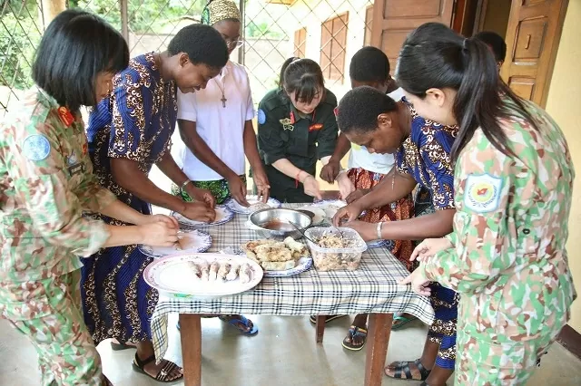 Tổ công tác hướng dẫn các em làm món ăn Việt Nam. (Nguồn: Cục Gìn giữ hòa bình Việt Nam)
