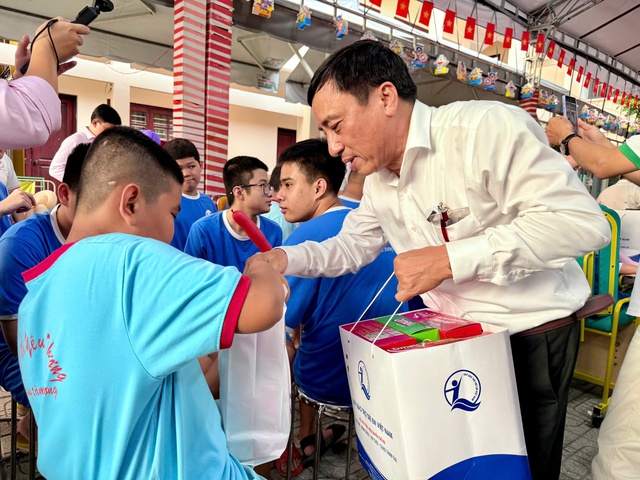 BSCKI Đào Văn Sinh - Trưởng đại diện VP Bộ Y tế tại TPHCM trao quà cho các em tại Trung tâm Điều dưỡng, Phục hồi chức năng – Trợ giúp trẻ và Hỗ trợ người khuyết tật.