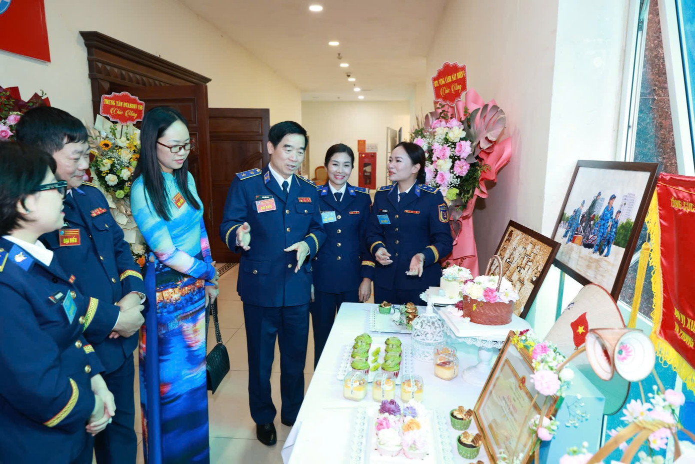 Trung tướng Bùi Quốc Oai cùng các đại biểu tham quan khu trưng bày của phụ nữ Cảnh sát biển.
