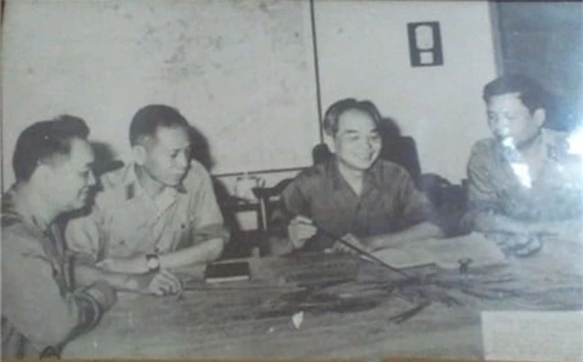 Trung tướng Lê Hữu Đức (ngoài cùng bên trái) trong một lần báo cáo tình hình chiến trường với Đại tướng Võ Nguyên Giáp. Ảnh tư liệu