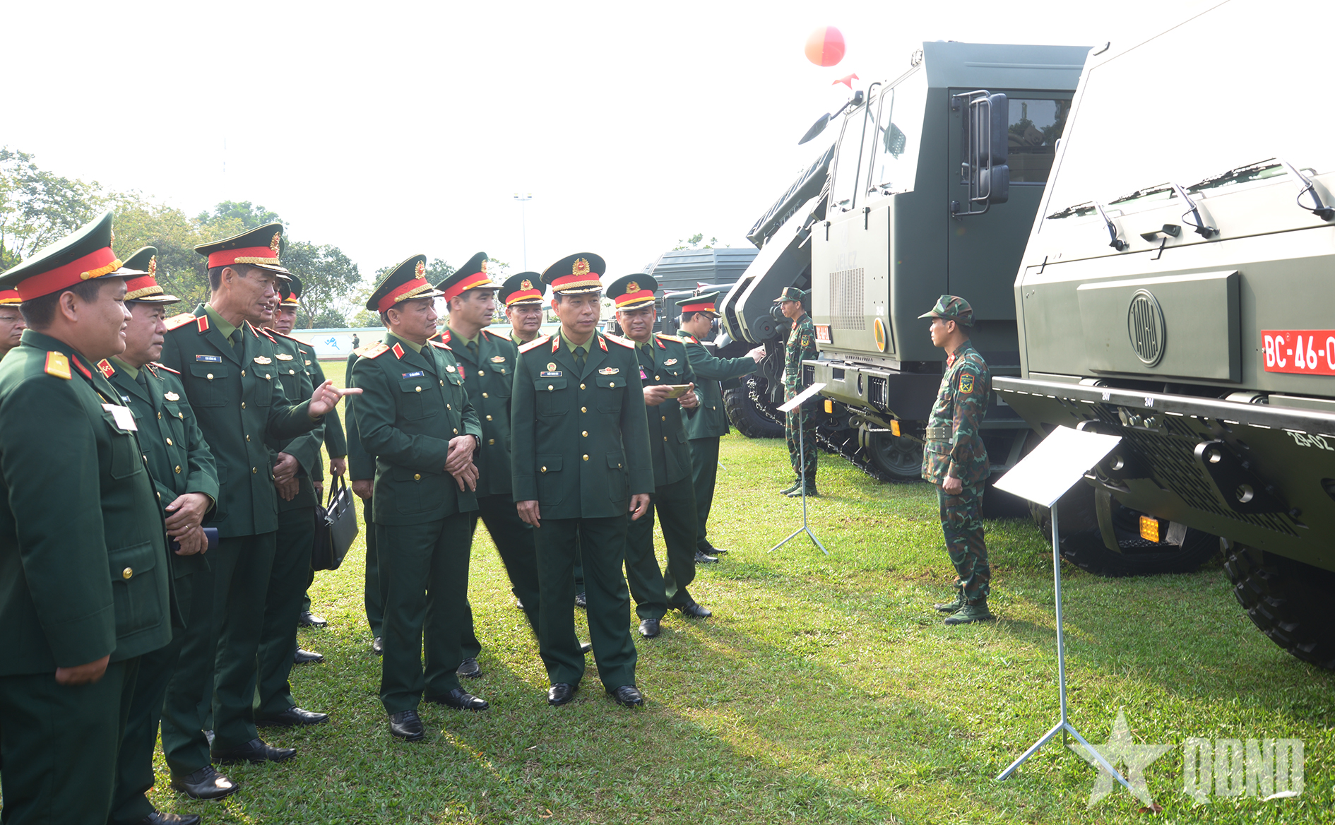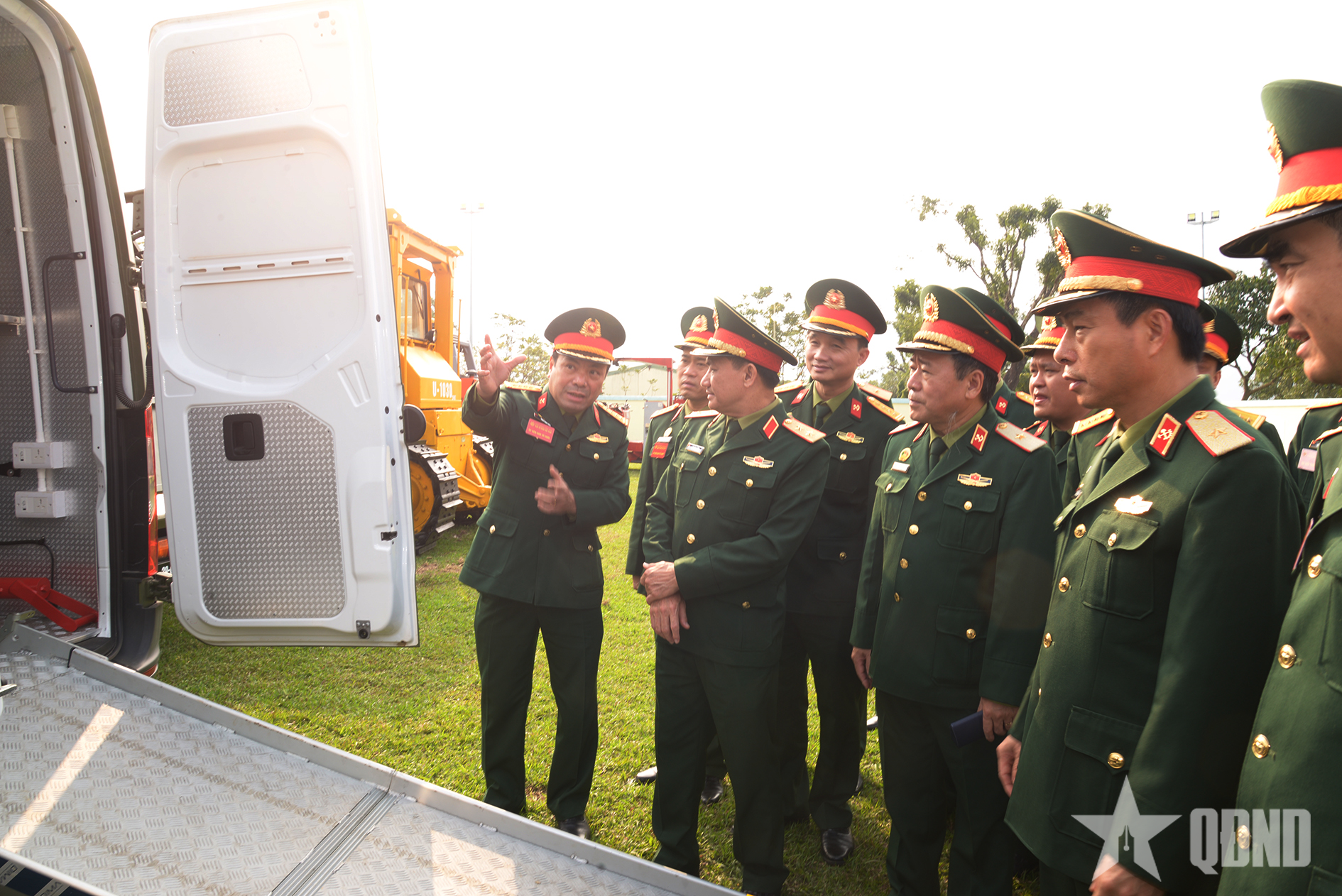 Trung tướng Lê Văn Hướng cùng các đại biểu kiểm tra trang bị kỹ thuật công binh.