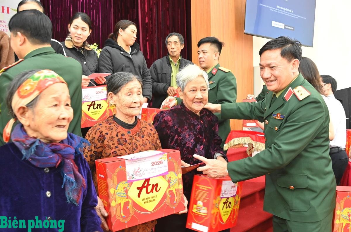 Trung tướng Lê Văn Hướng, Phó Tổng Tham mưu trưởng Quân đội Nhân dân Việt Nam và đoàn công tác tặng quà chúc mừng năm mới cán bộ, chiến sĩ Đồn Biên phòng Kỳ Khang. Ảnh: Thanh Giang