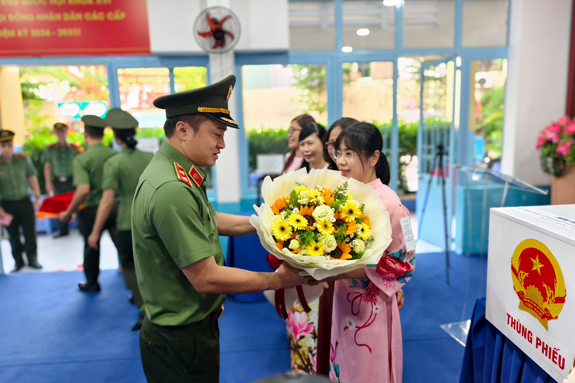 Trung tướng Mai Hoàng tặng hoa cho Tổ Bầu cử. Ảnh: N. TÂN