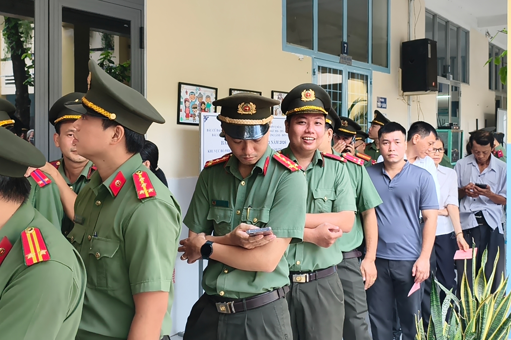 Hình ảnh cán bộ, chiến sĩ Công an TP.HCM chờ bỏ phiếu xong lập tức trở lại vị trí trực chiến bảo vệ ngày bầu cử tại TP.HCM. Ảnh: N. TÂN