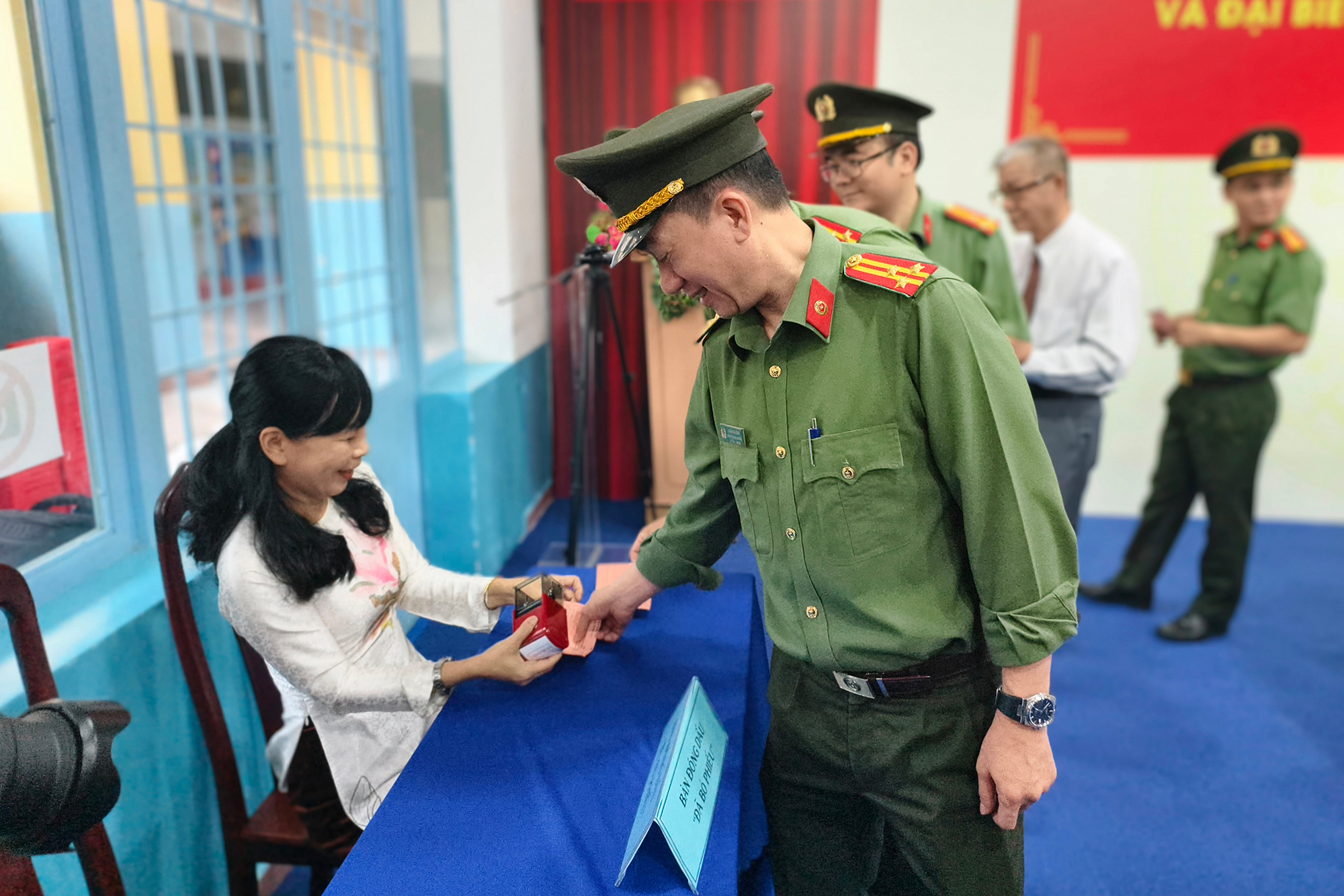 Trung tướng Mai Hoàng nhận phiếu bầu từ tổ bầu cử tại khu vực bầu cử số 7, phường Cầu Ông Lãnh. Ảnh: N. TÂN
