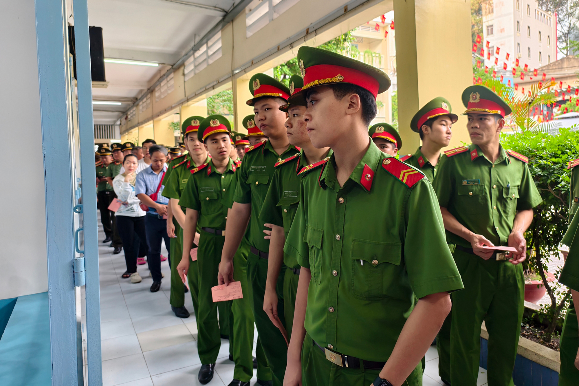 Các cán bộ, chiến sĩ Công an TP.HCM xếp hàng ngay ngắn, đảm bảo điều lệnh khi chờ đến lượt bỏ phiếu tại phường Cầu Ông Lãnh. Ảnh: N. TÂN