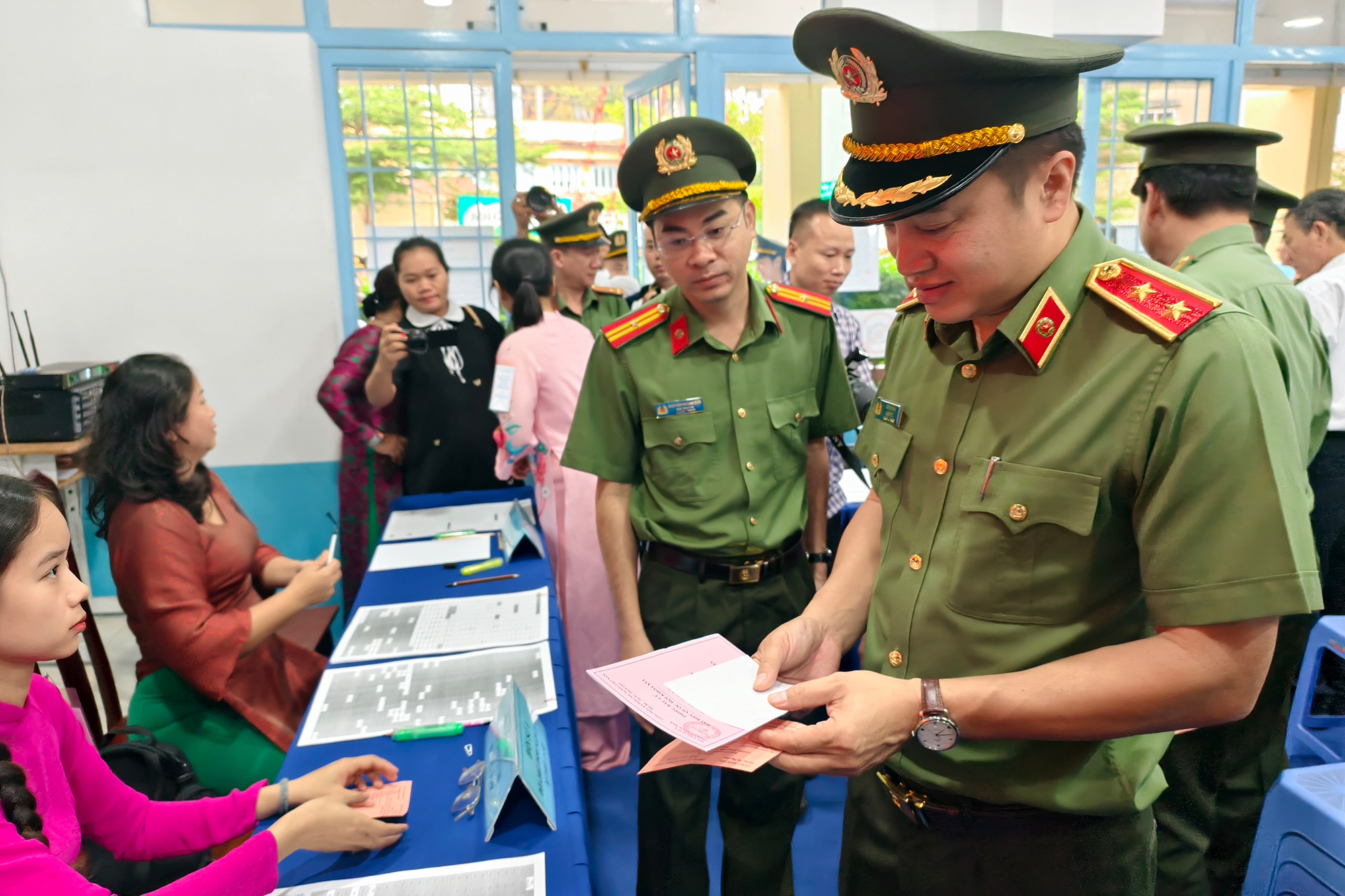 Giám đốc Công an TP.HCM, Trung tướng Mai Hoàng kiểm tra danh sách cử tri trước khi vào bỏ phiếu. Ảnh: N. TÂN