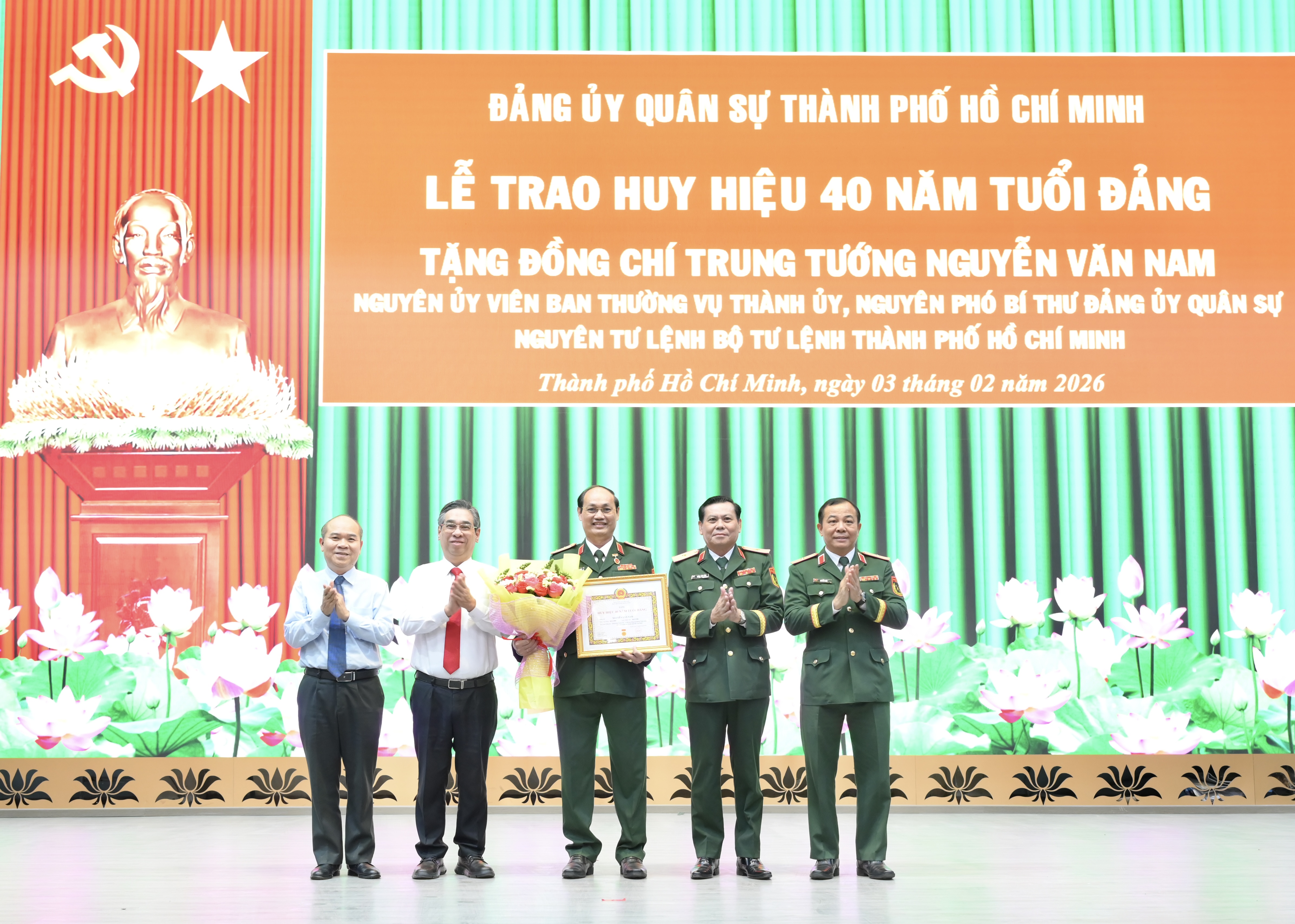 Chiều 3-2, Ban Thường vụ Đảng ủy Quân sự TPHCM tổ chức lễ trao Huy hiệu 40 năm tuổi Đảng tặng Trung tướng Nguyễn Văn Nam, nguyên Ủy viên Ban Thường vụ Thành ủy, nguyên Phó Bí thư Đảng ủy Quân sự, nguyên Tư lệnh Bộ Tư lệnh TPHCM.