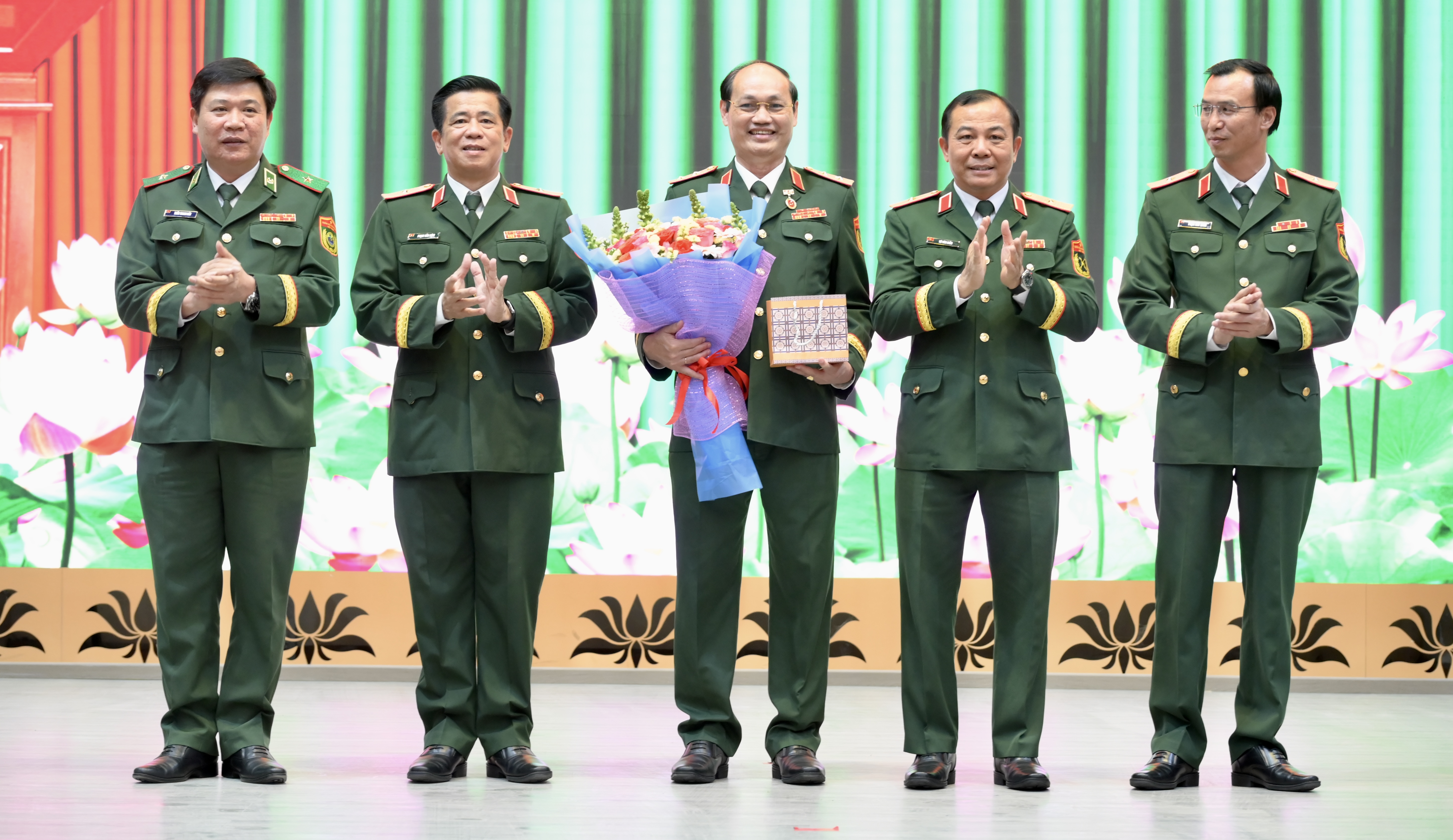 Đồng chí Nguyễn Phước Lộc cùng các đại biểu chúc mừng Trung tướng Nguyễn Văn Nam. Ảnh: VĂN MINH