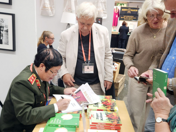 Nhà văn Hữu Ước ký tặng tiểu thuyết "Suối Cọp" in bằng tiếng Thụy Điển cho bạn đọc tại Hội chợ sách quốc tế Goteborg, Thụy Điển, tháng 9/2024.