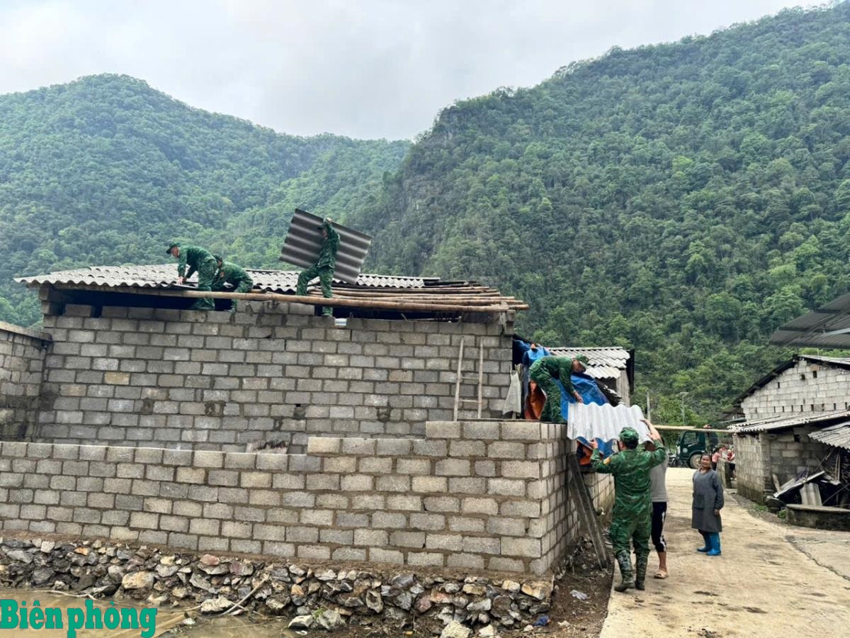 Cán bộ, chiến sĩ Đồn Biên phòng Ngọc Côn, Bộ đội Biên phòng Cao Bằng tham gia giúp dân khắc phục hậu quả thiên tai. Ảnh: Huy Dương