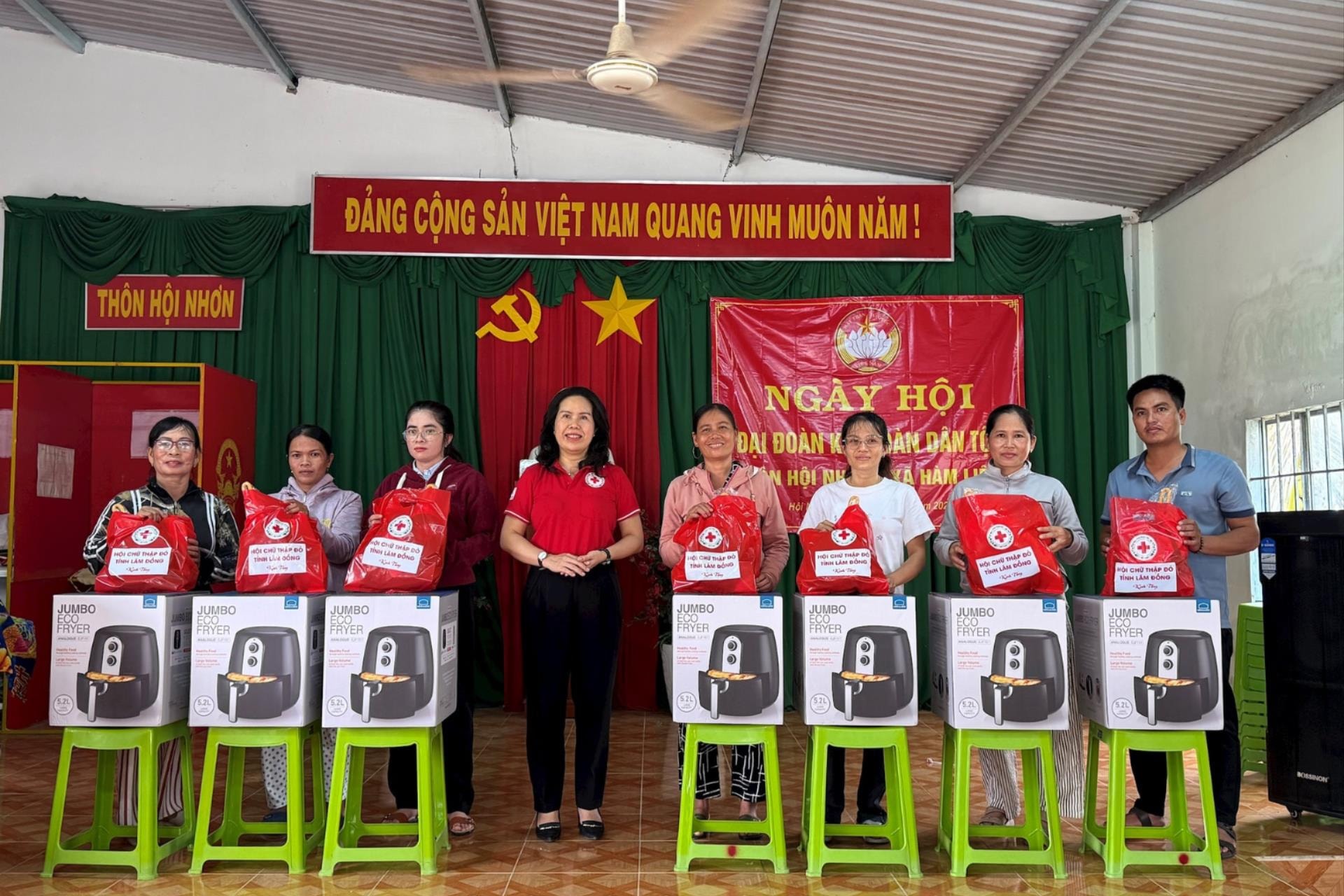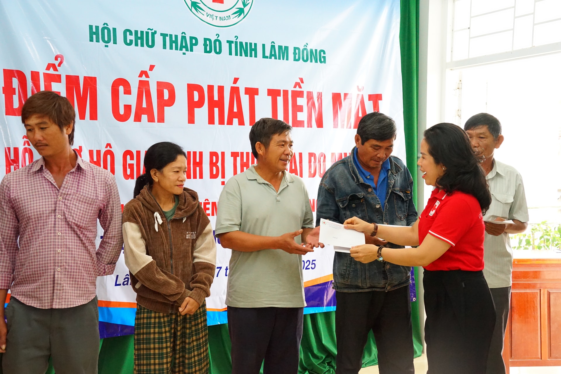 Bà Nguyễn Thị Thanh Nhàn, Phó Chủ tịch Hội Chữ thập đỏ tỉnh Lâm Đồng trao quà cho các hộ dân