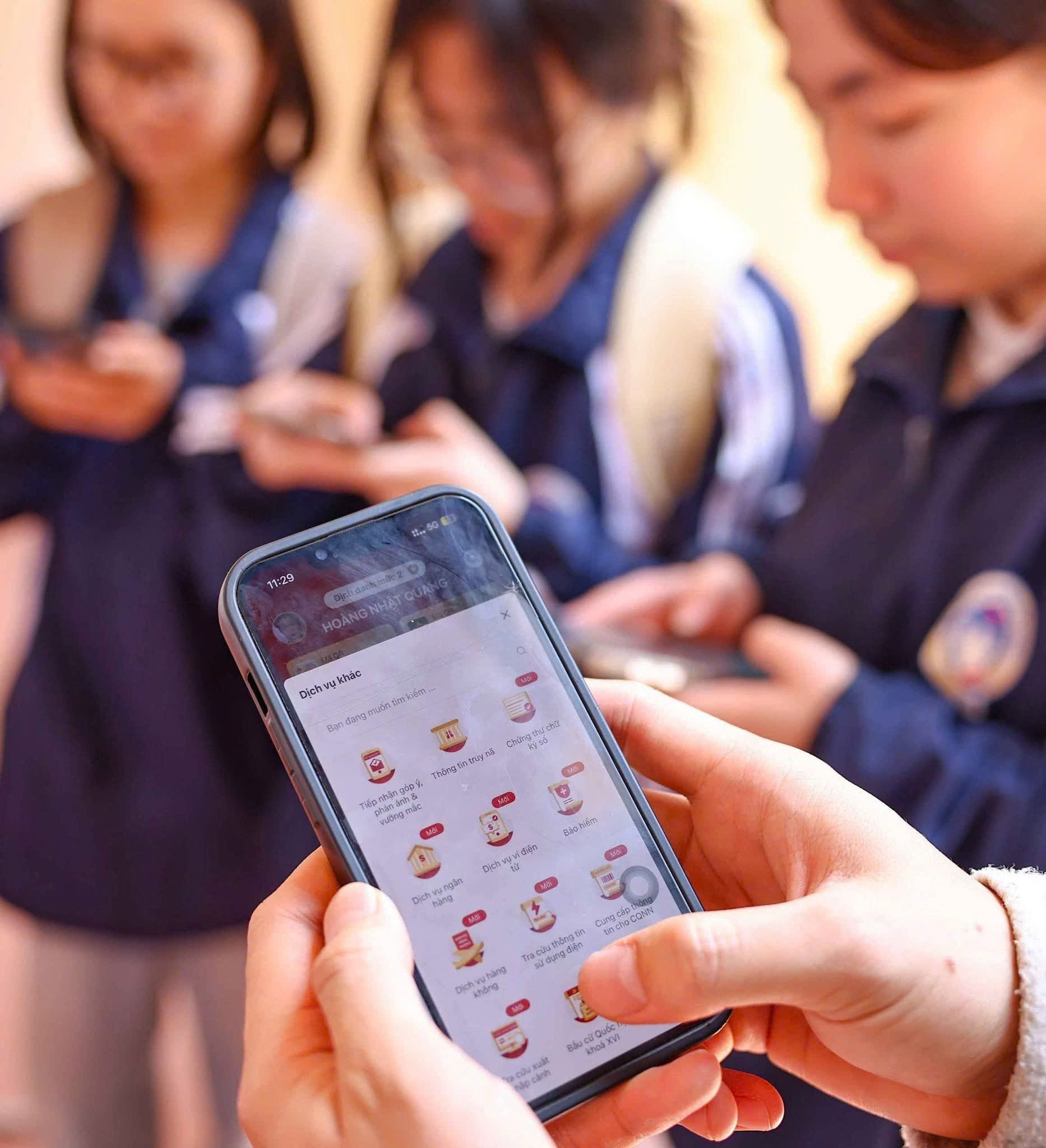 Các sinh viên theo dõi thông tin về bầu cử Quốc hội khóa XVI trên VNeID và xem danh sách người ứng cử. Ảnh: TTX