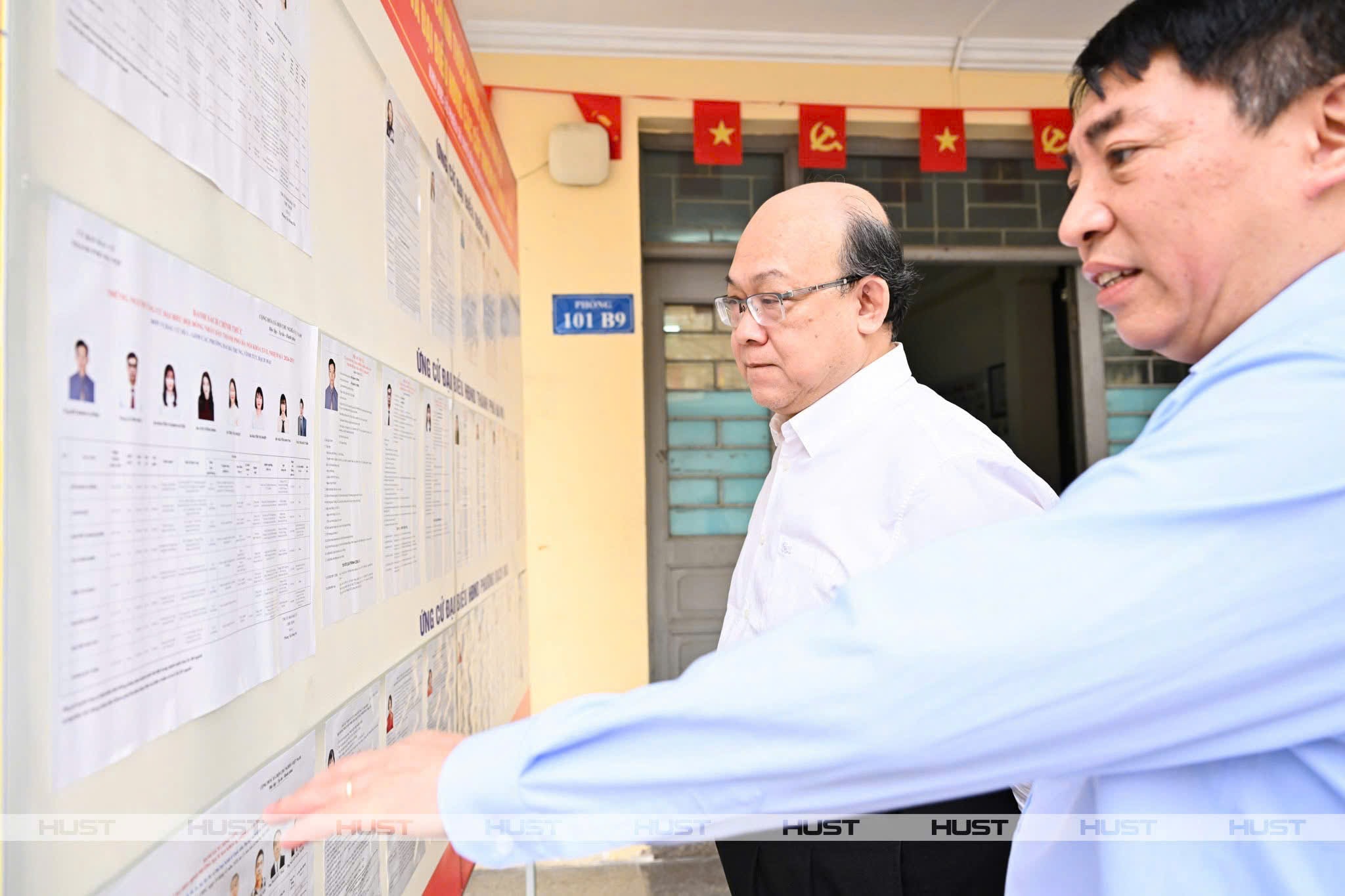 PGS. Huỳnh Quyết Thắng (áo trắng) - Giám đốc ĐHBK Hà Nội và PGS. Trần Ngọc Khiêm - Phó Giám đốc ĐHBK Hà Nội - kiểm tra công tác chuẩn bị bầu cử tại Khu vực bỏ phiếu số 20 tại B7 Ký túc xá Đại học Bách khoa Hà Nội. Ảnh: HUST