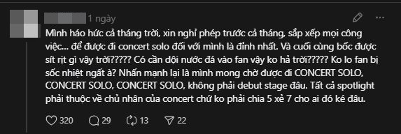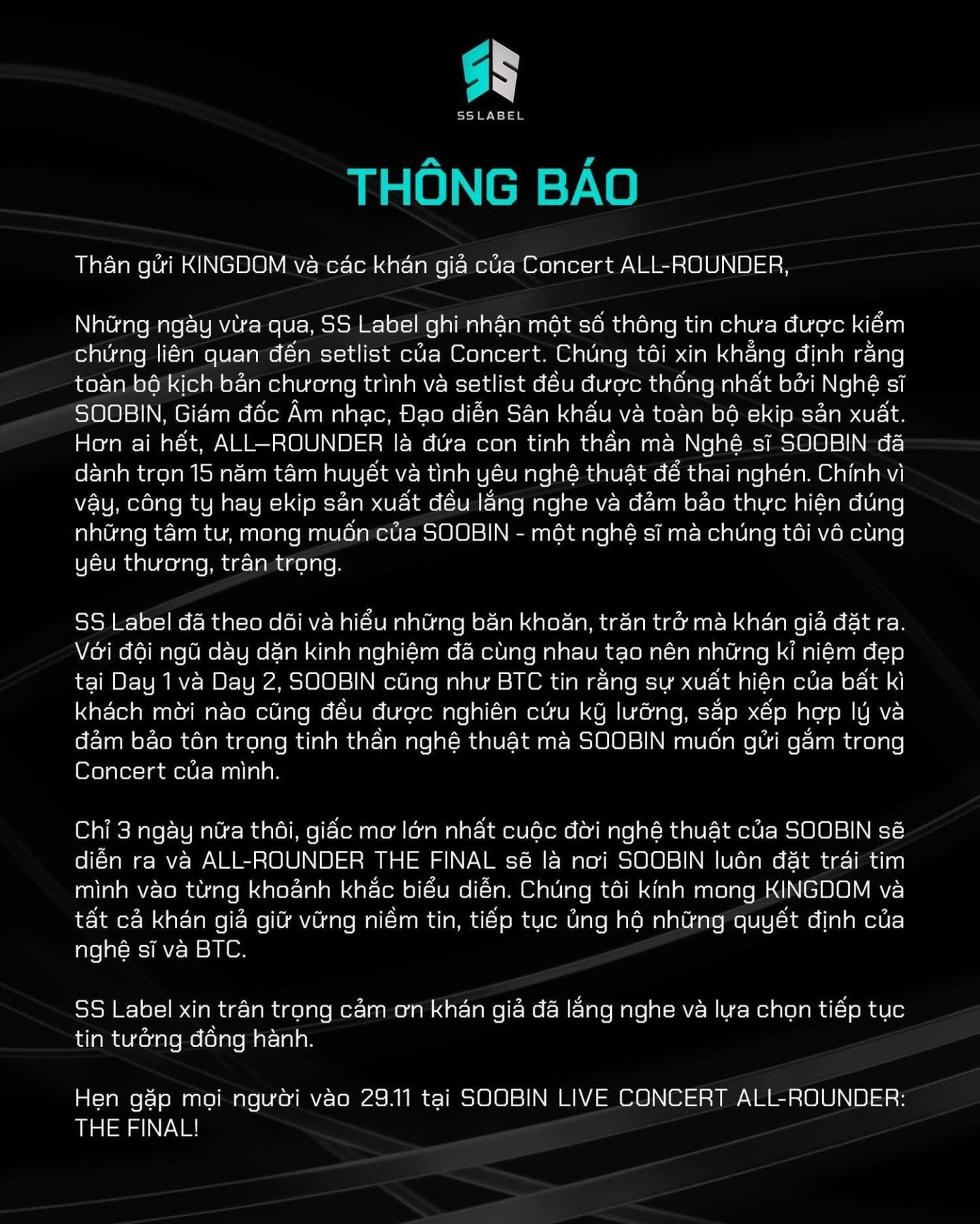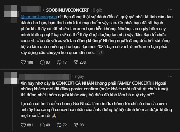 Chỉ còn vài ngày nữa, concert ALL-ROUNDER D-3 của SOOBIN sẽ chính thức diễn ra tại TP.HCM. Thế nhưng khác với bầu không khí háo hức đáng ra phải có, cộng đồng người hâm mộ KINGDOMs của nam ca sĩ lại đang bày tỏ sự bất bình của mình khắp mạng xã hội, thậm chí đã có không ít người "dứt áo ra đi".