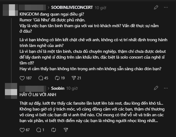 Thông tin này đã gây nên làn sóng bất bình, tranh cãi khắp mạng xã hội, đặc biệt đến từ nội bộ KINGDOMs. Không ít người hâm mộ đã lên tiếng, bày tỏ sự không hài lòng của mình khi SOOBIN sắp sửa song ca với một khách mời tân binh thông qua ca khúc Giá Như vốn được mong chờ là sân khấu đỉnh cao của riêng một mình nam ca sĩ. Thậm chí nhiều người hâm mộ lâu năm đã tuyên bố "thoát fan" vì không thể chấp nhận quyết định này từ SOOBIN và phía ban tổ chức concert.