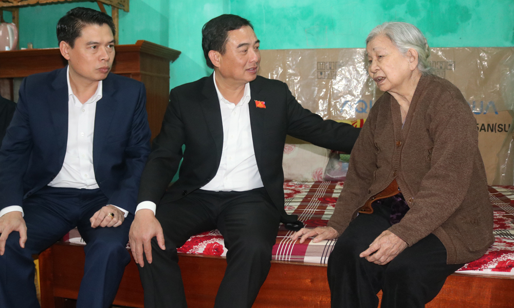Đồng chí Vũ Trí Hải ân cần thăm hỏi sức khỏe, hoàn cảnh đời sống gia đình bà Nguyễn Thị Thịnh là vợ liệt sỹ ở thôn Đông Xá, xã Tam Đa.