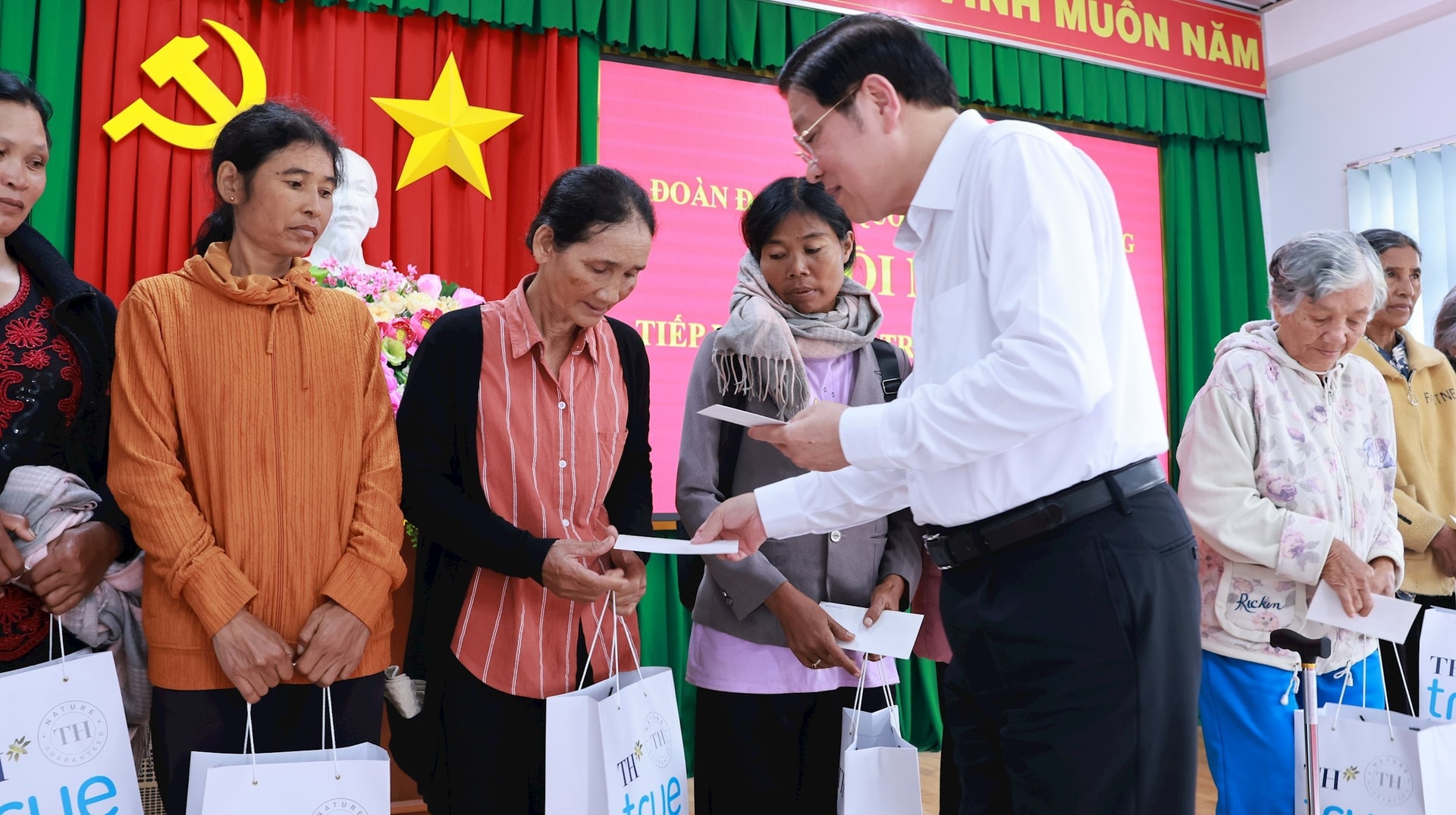 Trưởng Ban Nội chính Trung ương Phan Đình Trạc và Phó trưởng Đoàn ĐBQH tỉnh Lâm Đồng Dương Khắc Mai trao quà cho các gia đình khó khăn