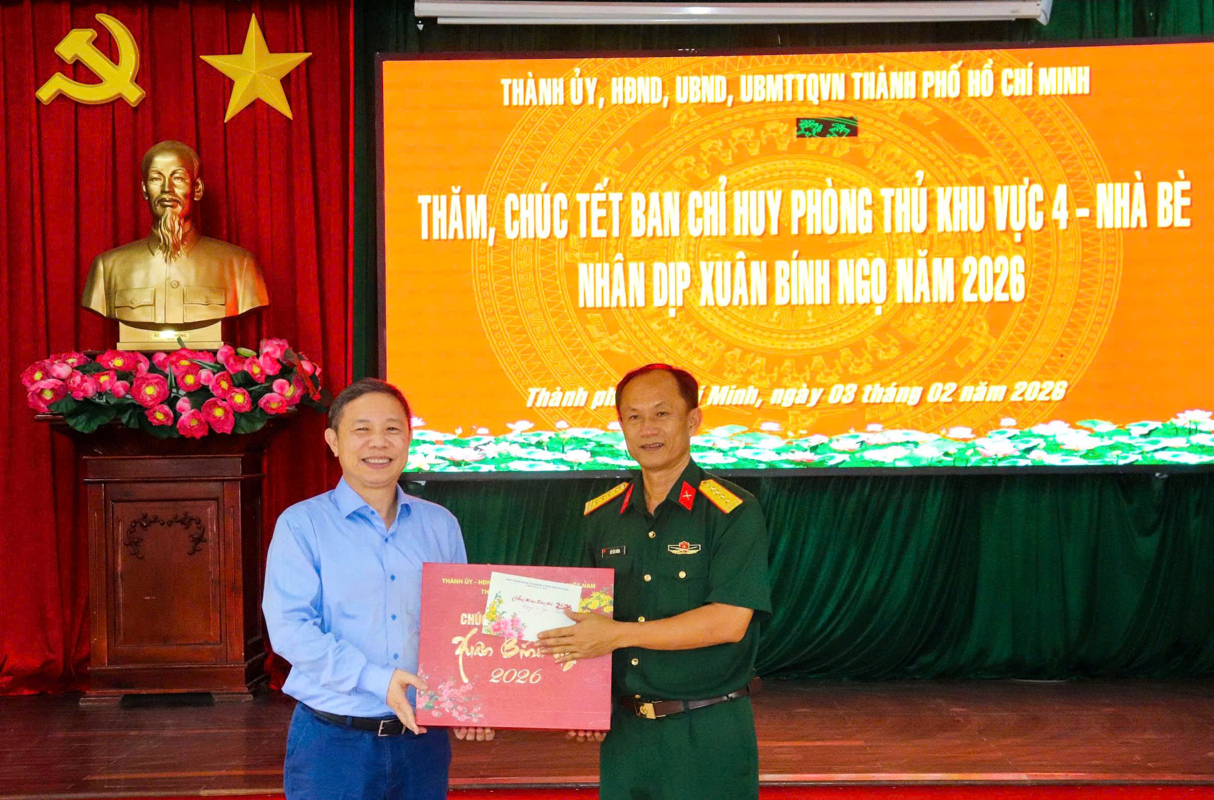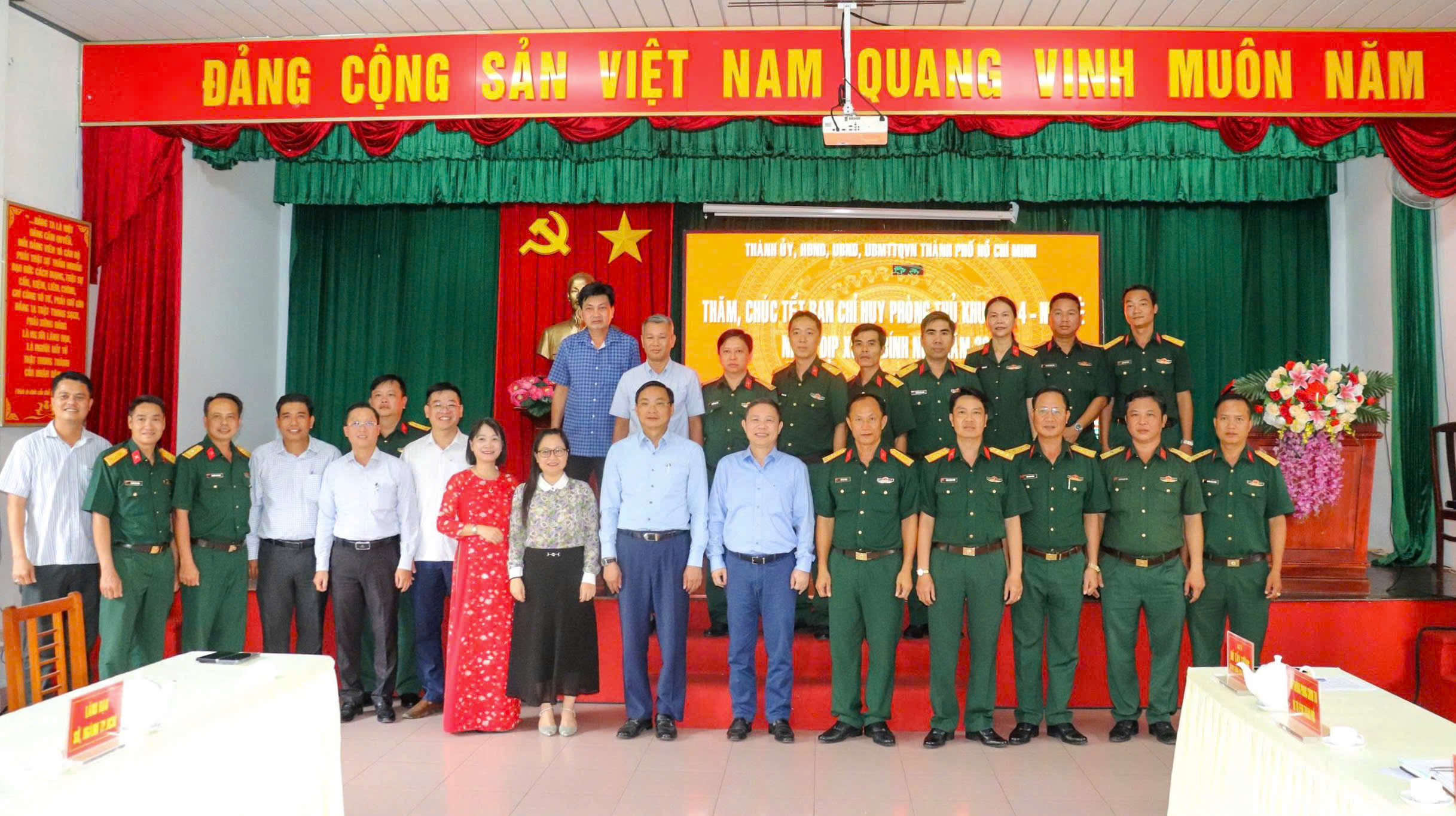Tại Ban Chỉ huy Phòng thủ khu vực 4 – Nhà Bè (Bộ Tư lệnh TPHCM), Trưởng Ban Tuyên giáo và Dân vận Thành ủy TPHCM gửi lời thăm hỏi, chúc sức khỏe đến cán bộ, chiến sĩ đơn vị, chúc đơn vị hoàn thành xuất sắc nhiệm vụ năm 2026.
