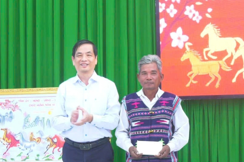 Đồng thời, trao 4 suất quà cho các gia đình chính sách, mỗi suất trị giá 5 triệu đồng, gồm bà Nguyễn Thị Nữ (thôn Bình Sơn), ông Đinh Sĩ Tiến, bà Huỳnh Thị Đi, ông Nguyễn Hồng Chu (thôn Bình Nghĩa). Đoàn cũng thăm, chúc Tết ông Mang Biên, người có uy tín tiêu biểu trong đồng bào dân tộc thiểu số tại địa phương, trao suất quà trị giá 2 triệu đồng tiền mặt.