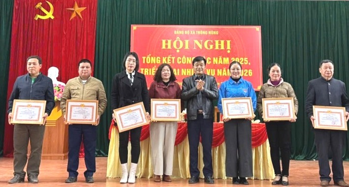 Lãnh đạo Đảng ủy xã Thông Nông trao giấy khen cho các tập thể hoàn thành xuất sắc nhiệm vụ năm 2025.