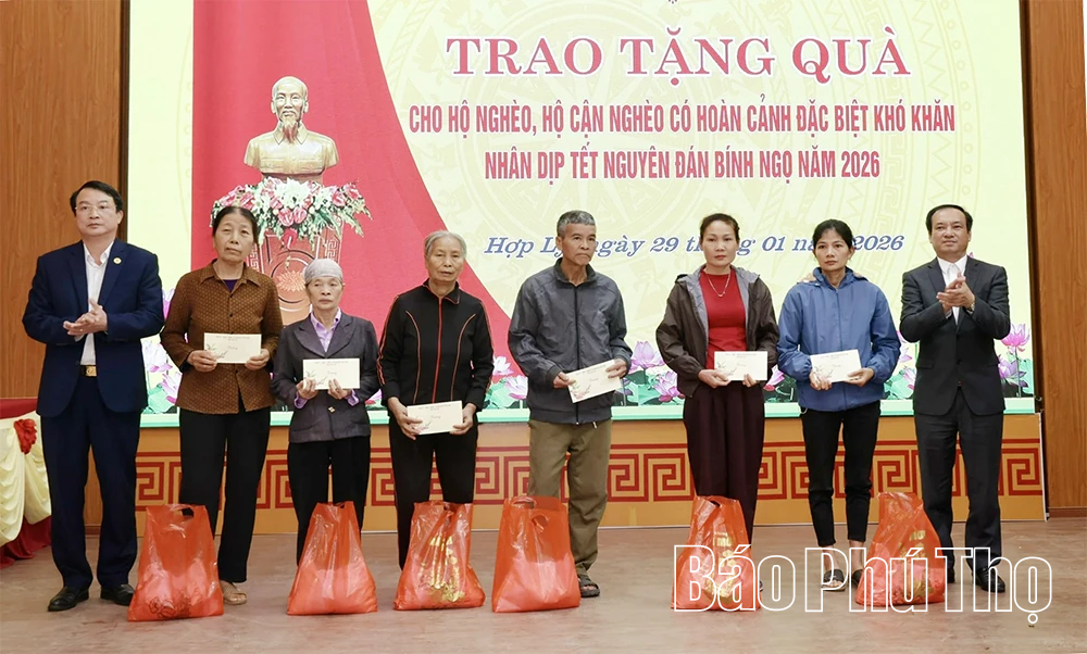 Nhân dịp này, đồng chí Trưởng Ban Tuyên giáo và Dân vận Tỉnh ủy Lương Đức Minh trao 25 suất quà của tỉnh tặng hộ nghèo xã Hợp Lý; các đơn vị: Ngân hàng BIDV Chi nhánh Vĩnh Phúc; Báo và Phát thanh, truyền hình Phú Thọ trao 50 suất quà tặng hộ nghèo, cận nghèo có hoàn cảnh khó khăn trên địa bàn.