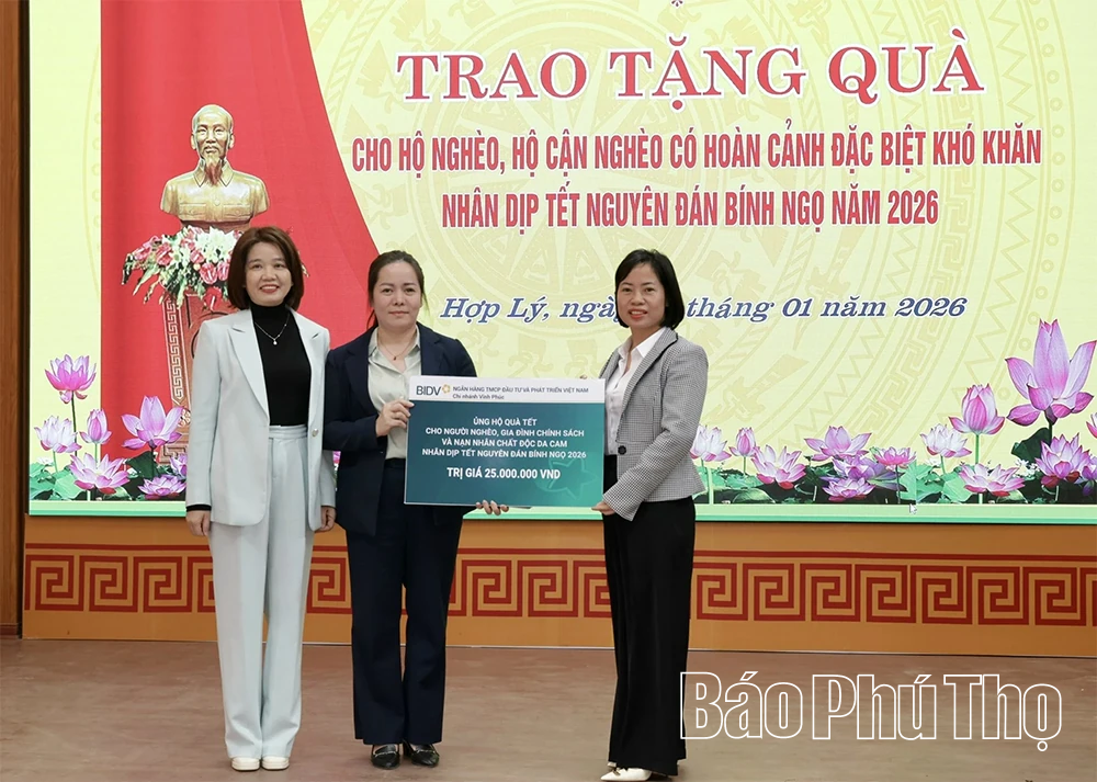 Lãnh đạo Báo và Phát thanh, truyền hình Phú Thọ; Ngân hàng BIDV Chi nhánh Vĩnh Phúc trao quà cho hộ nghèo, cận nghèo, hộ có hoàn cảnh khó khăn.