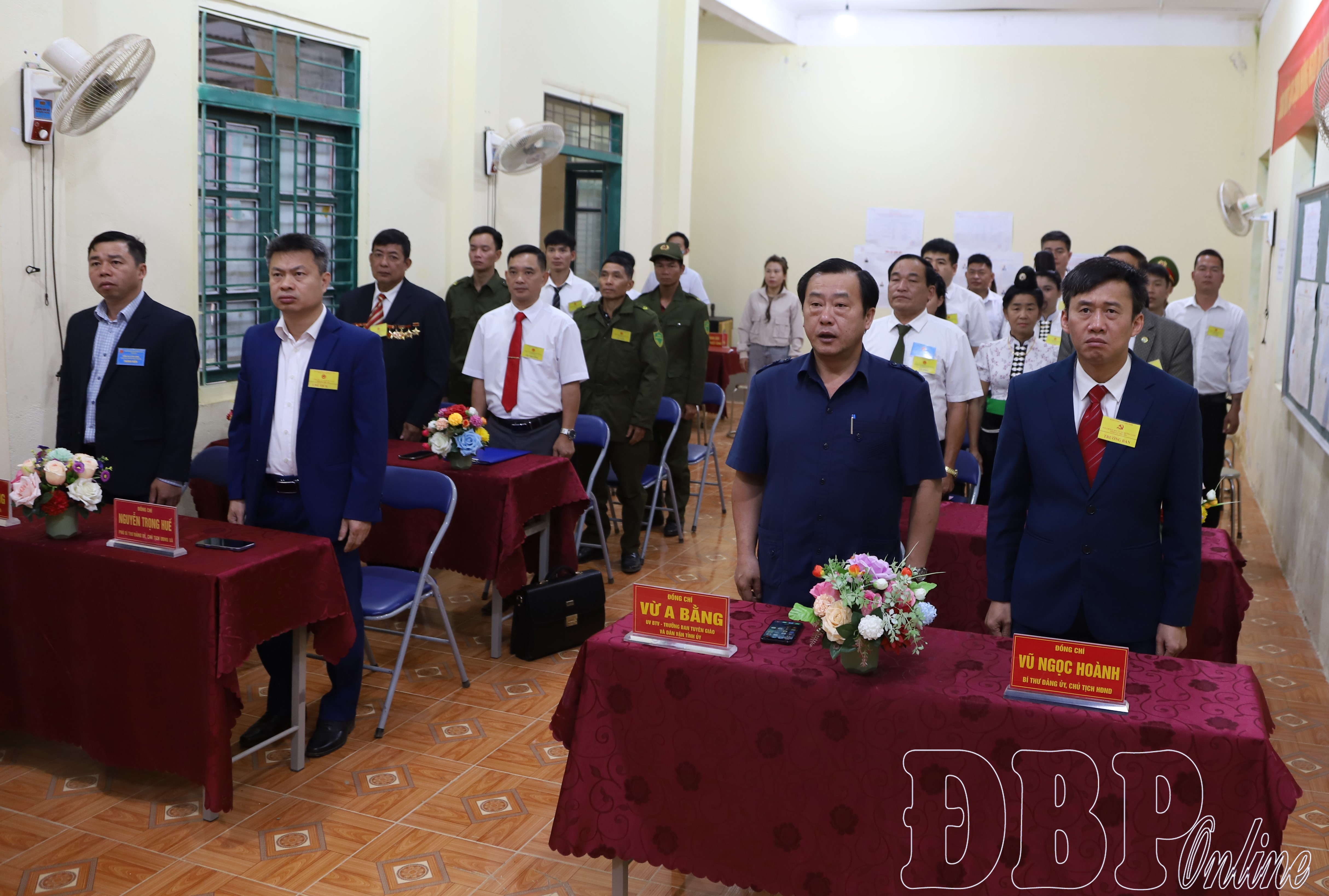 Trưởng ban Tuyên giáo và Dân vận Tỉnh ủy Vừ A Bằng cùng các đại biểu và cử tri thực hiện nghi lễ chào cờ khai mạc bầu cử tại khu vực bỏ phiếu số 9, xã Mường Luân.