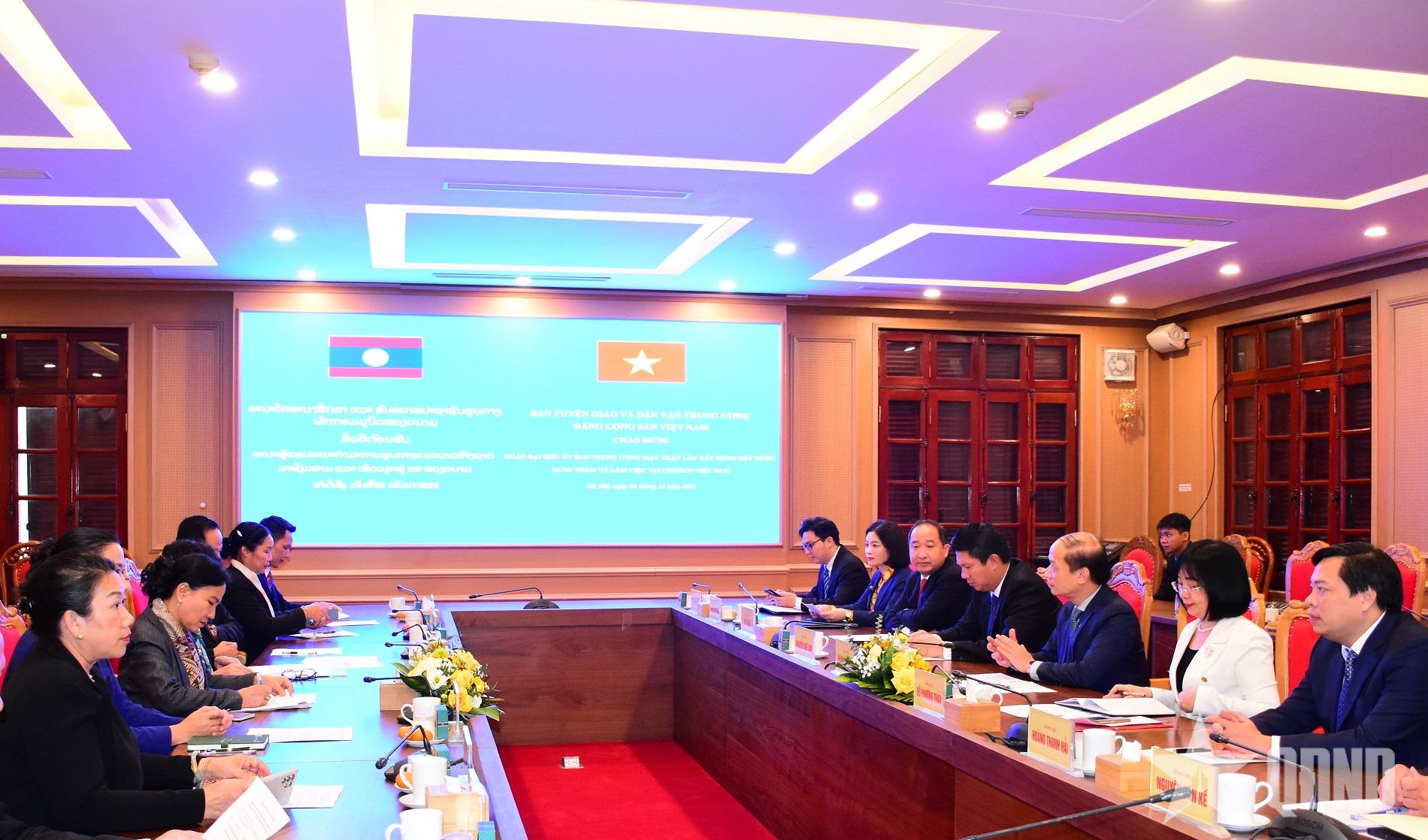 Đoàn đại biểu Ban Tuyên giáo và Dân vận Trung ương trao đổi chuyên môn với Đoàn đại biểu Ủy ban Trung ương Mặt trận Lào xây dựng đất nước.
