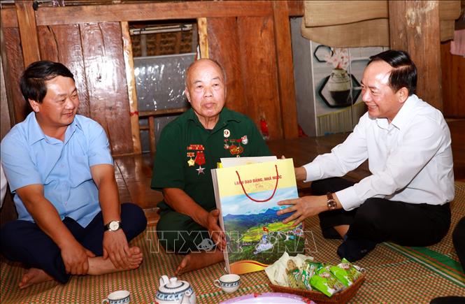 Đồng chí Trịnh Văn Quyết, Ủy viên Bộ Chính trị, Bí thư Trung ương Đảng, Trưởng Ban Tuyên giáo và Dân vận Trung ương thăm, tặng quà cho gia đình ông Nguyễn Xuân Chè, bệnh binh (tổ 32, thôn Tha, phường Hà Giang 1).