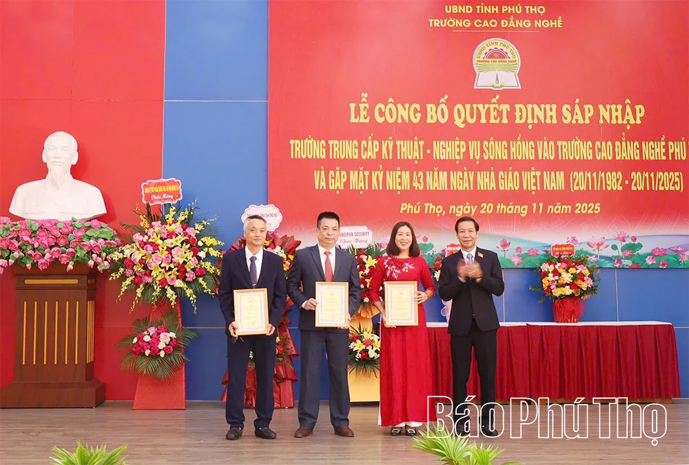 Tại buổi lễ, nhà trường đã công bố Quyết định số 2681 ngày 25/9/2025 của Bộ Giáo dục và Đào tạo về việc sáp nhập Trường Trung cấp Kỹ thuật - Nghiệp vụ Sông Hồng vào Trường Cao đẳng nghề Phú Thọ. Đây là dấu mốc quan trọng khẳng định sự quan tâm của các Bộ ngành Trung ương và của tỉnh Phú Thọ đối với sự phát triển của giáo dục nghề nghiệp địa phương, mở ra cơ hội lớn cho nhà trường trong việc tăng cường nguồn lực đội ngũ và cơ sở sở vật chất, mở rộng quy mô, ngành nghề đào tạo, nâng cao chất lượng giáo dục, góp phần phục vụ nhu cầu nhân lực của tỉnh trong giai đoạn mới.
