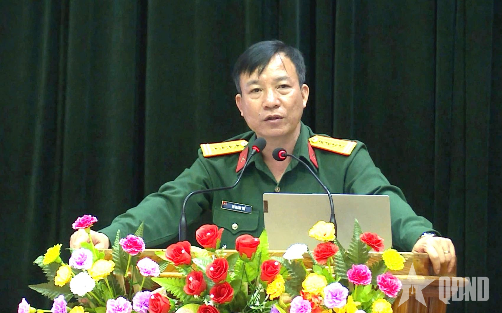 Đại tá Vũ Thanh Thế, Bí thư Đảng ủy, Phó hiệu trưởng Trường Cao đẳng nghề số 21 (Binh đoàn 15) phát biểu.