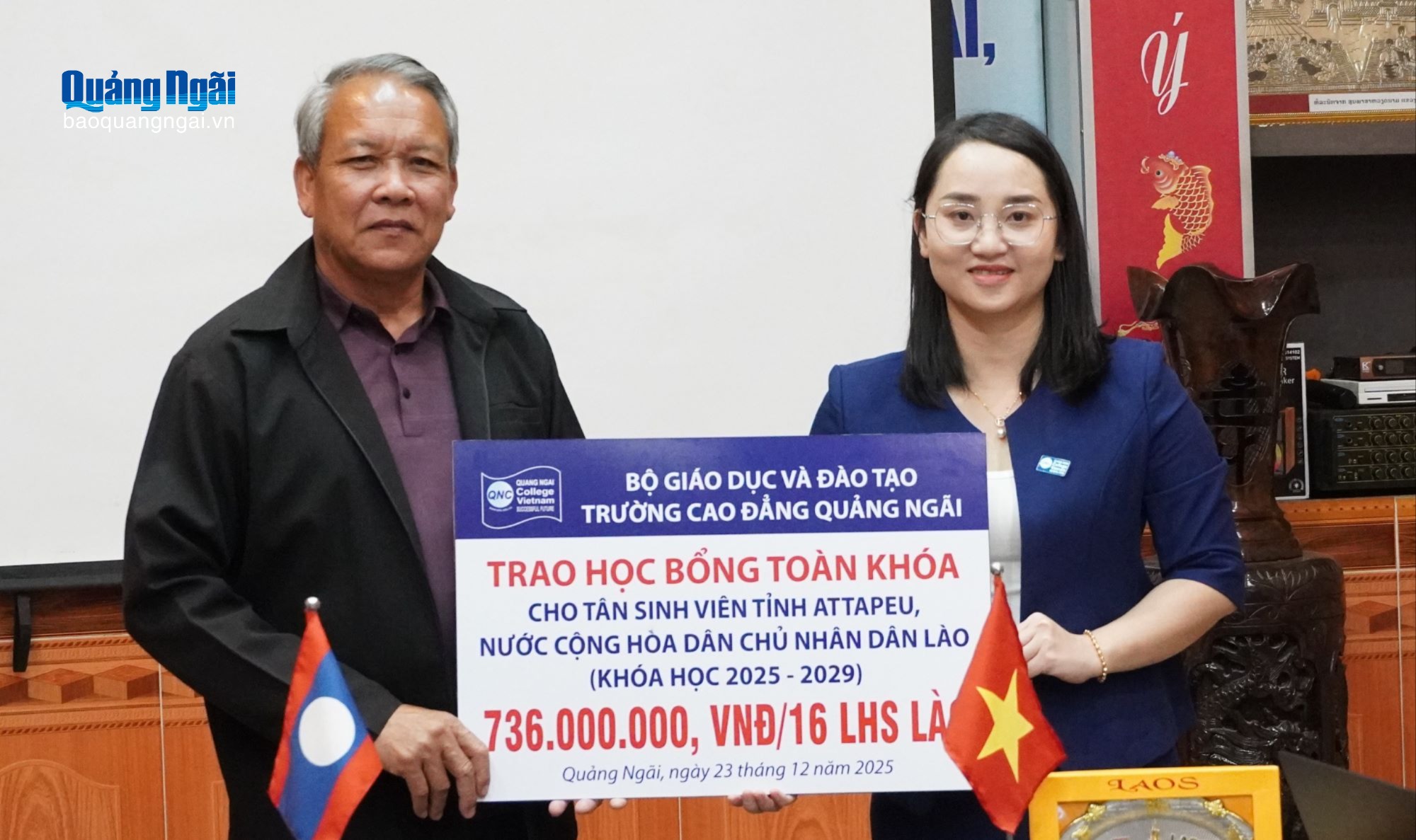 Được biết, từ năm 2022 đến nay, Trường Cao đẳng Quảng Ngãi đã đồng hành, hỗ trợ đào tạo cho 50 sinh viên Lào, trong đó có 30 sinh viên tỉnh Attapeu, với tổng kinh phí tài trợ khoảng 1,4 tỷ đồng. Riêng trong năm nay, Trường Cao đẳng Quảng Ngãi trân trọng trao tặng 16 suất học bổng toàn phần, với tổng trị giá 736 triệu đồng.