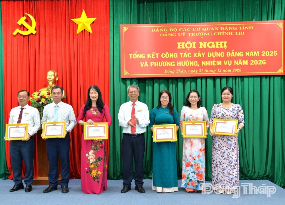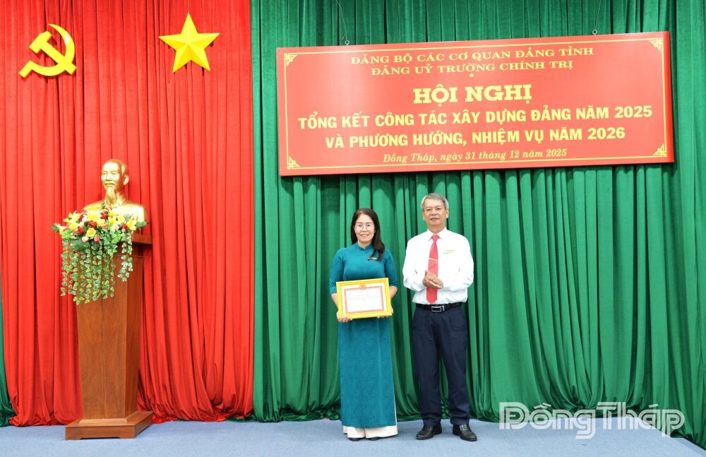 Hiệu trưởng Trường Chính trị tỉnh Đồng Tháp Nguyễn Phước Dũng tặng Giấy khen cho chi bộ đạt thành tích xuất sắc nhiệm vụ năm 2025.