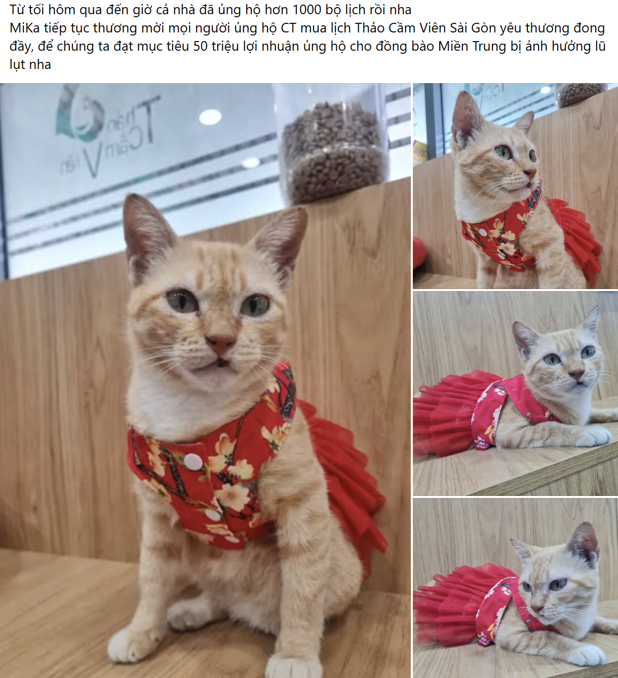 Vừa qua, đại diện Thảo Cầm Viên cùng Mika đã trao tặng số tiền 80 triệu đồng để sẻ chia khó khăn với đồng bào miền Trung. Được biết, trong số đó có 30 triệu đồng là tấm lòng của tập thể Cán bộ - Công nhân viên, 50 triệu đồng còn lại chính là toàn bộ lợi nhuận từ việc phát hành 5.000 bộ lịch 2026 "Yêu thương đong đầy". Hành động thiết thực này không chỉ thể hiện tinh thần tương thân tương ái mà còn đánh dấu cột mốc "sự nghiệp" của mèo Mika.