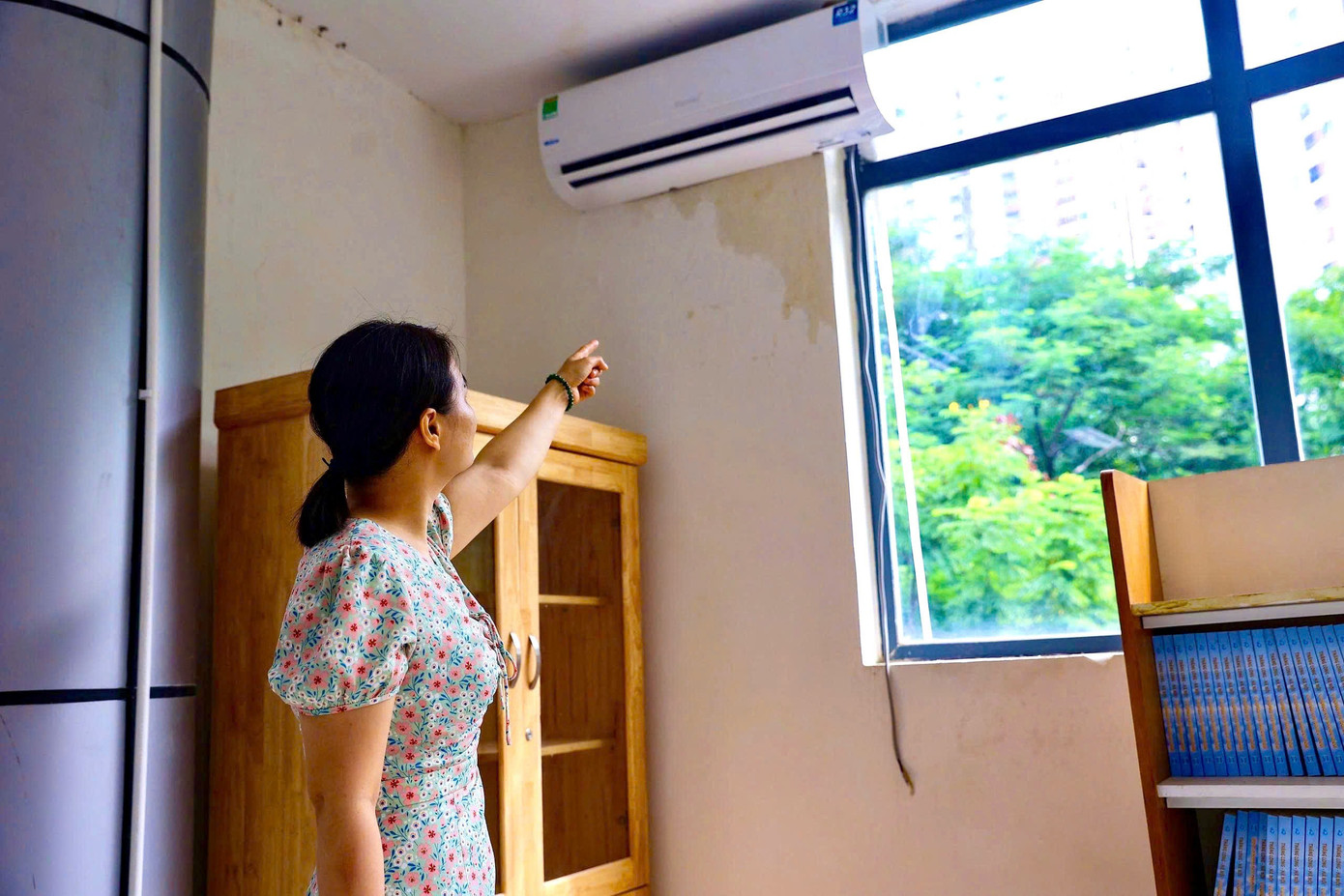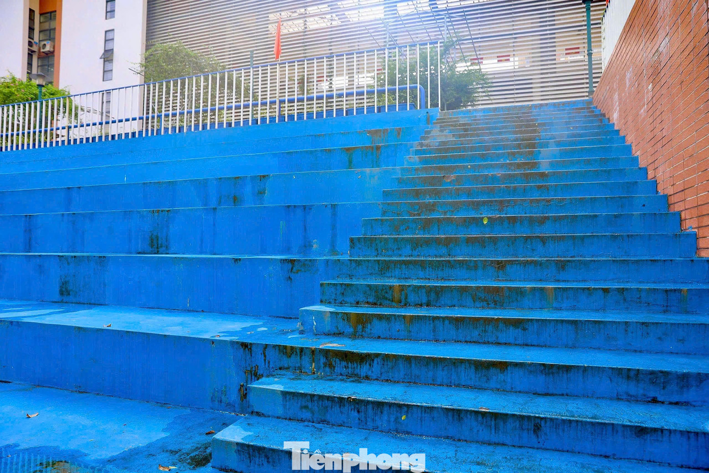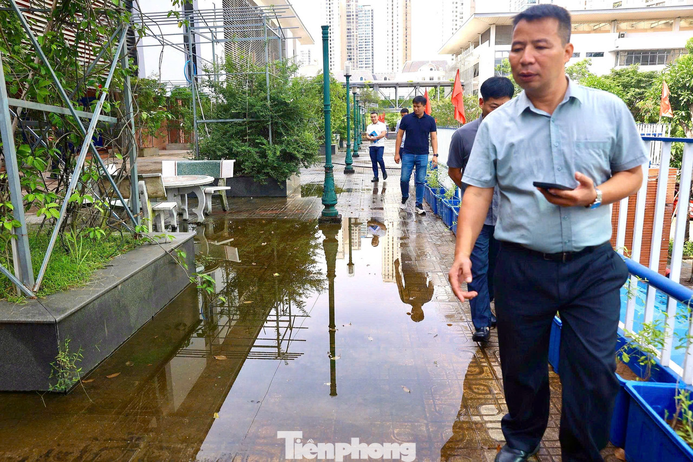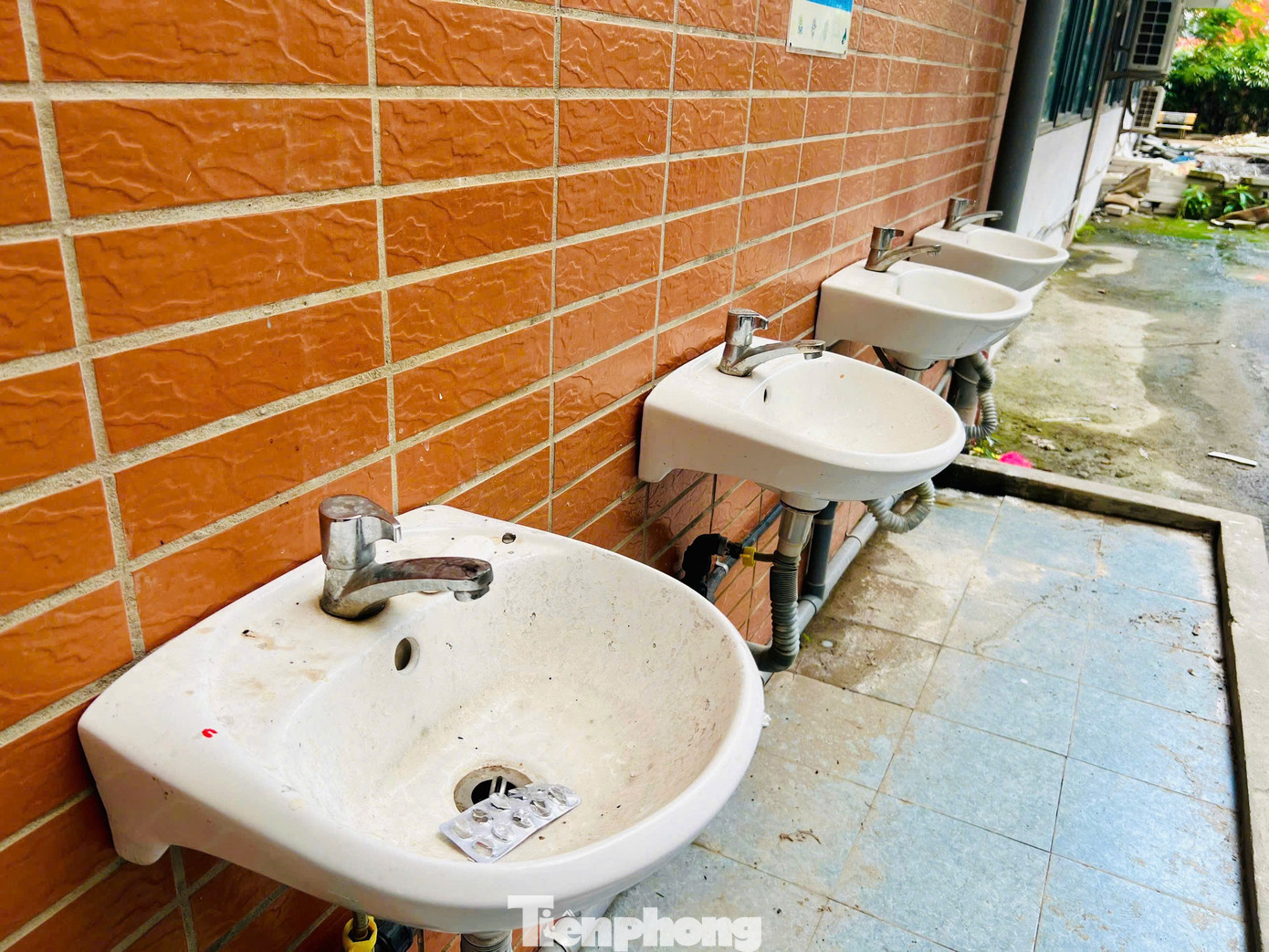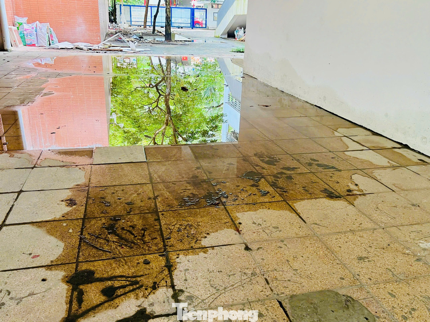 Trên mặt sàn tầng 1, nhiều vũng nước đọng, nước chảy lênh láng cho thấy một khung cảnh nhếch nhác, bẩn thỉu. Theo bảo vệ nhà trường, ống dẫn nước từ các tầng trên không được đi ngầm mà dẫn chảy thẳng xuống mặt sàn tầng 1 nên dù nhân viên có dọn dẹp, sau đó nước lại chảy lênh láng ra sàn.
