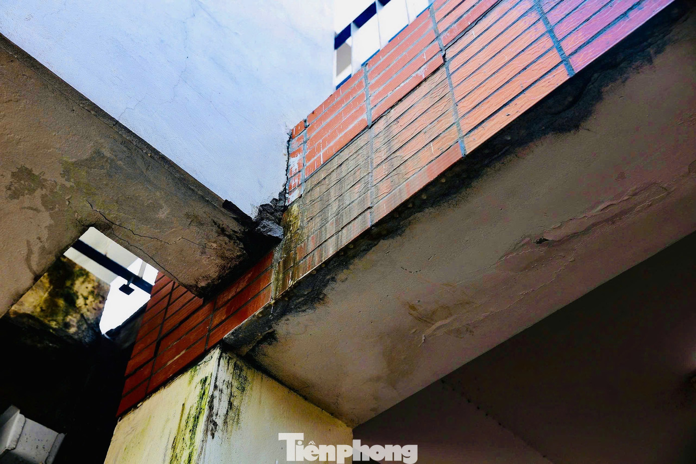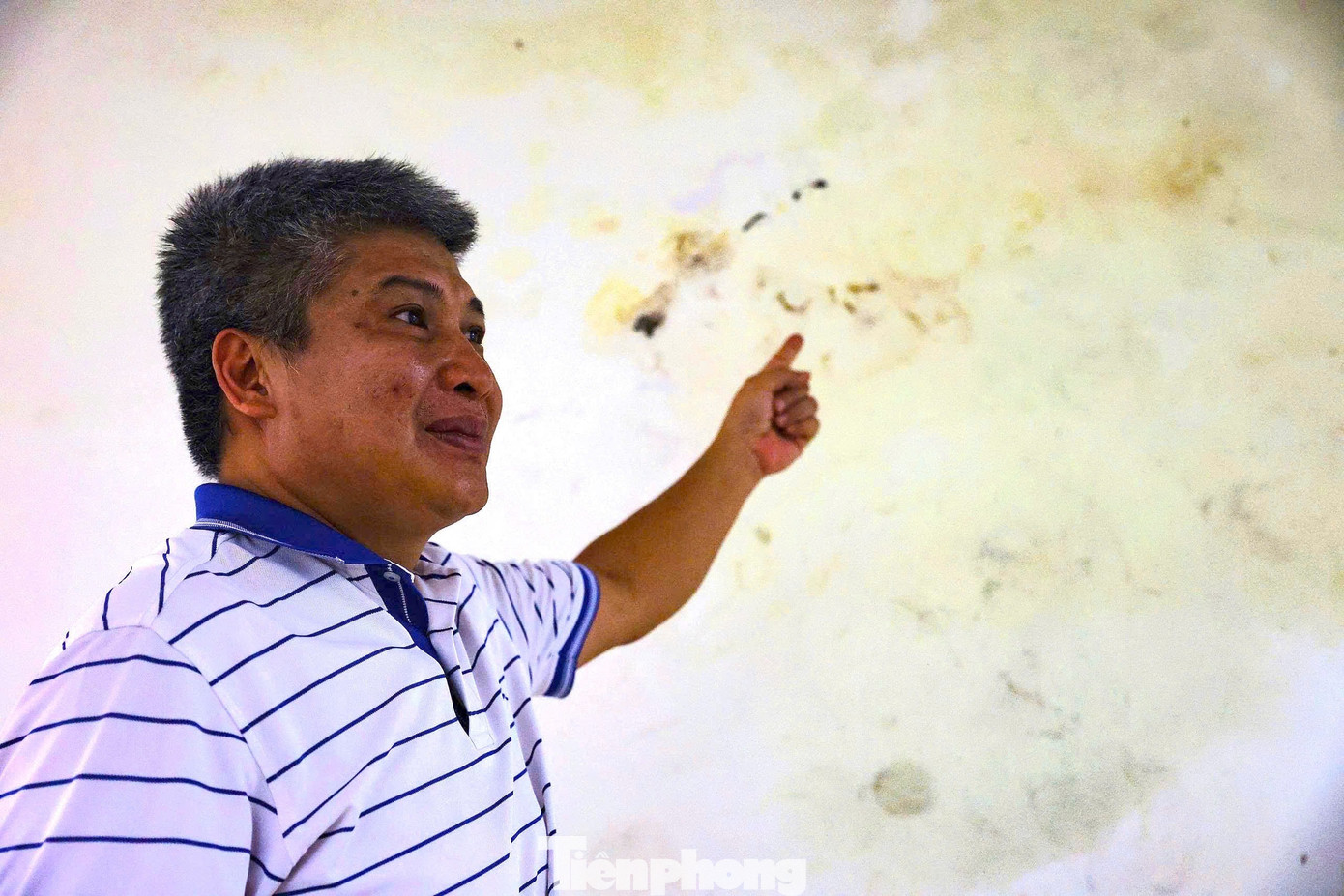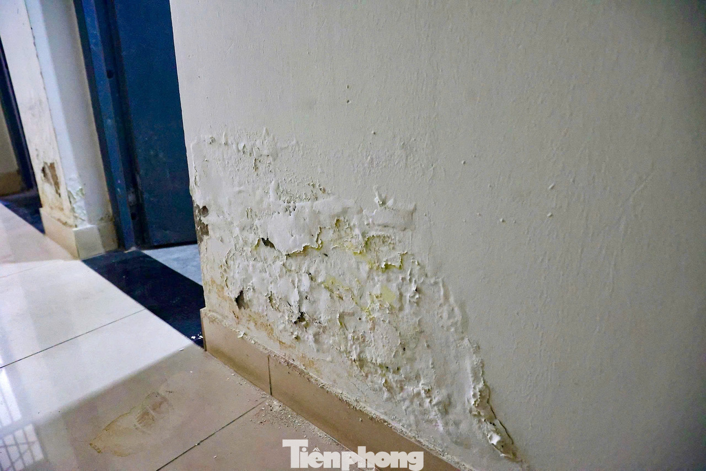 Ghi nhận của PV Tiền Phong tại Trường THPT Chuyên Hà Nội Amsterdam sáng 16/10 cho thấy, nhiều mảng tường bị bong tróc, thấm nước. Khu vực tầng trệt, nơi có các phòng chức năng phòng dụng cụ thể dục, phòng y tế… nước ngấm loang lổ ở nhiều cột dầm bê tông.