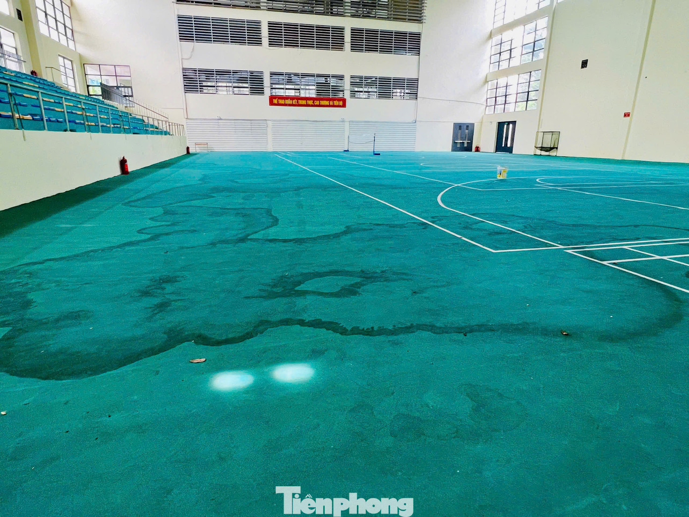 Thầy giáo dạy bộ môn Thể dục cho biết, nhà thể chất của trường hiện đại, có quy mô lên tới 400 học sinh, cùng lúc có thể bố trí 8-10 lớp học các môn cầu lông, đá cầu, bóng rổ. Trước khi cải tạo, nhà thể chất hễ mưa là dột nhưng cải tạo xong, tình trạng này không những không cải thiện mà còn dột nặng hơn. Trong đợt mưa to do ảnh hưởng bão số 11 vừa qua, nước trên mái chảy xuống, biến sàn thành ao nước. Đến nay, nước đã rút nhưng vết loang vẫn bám trên mặt sàn.